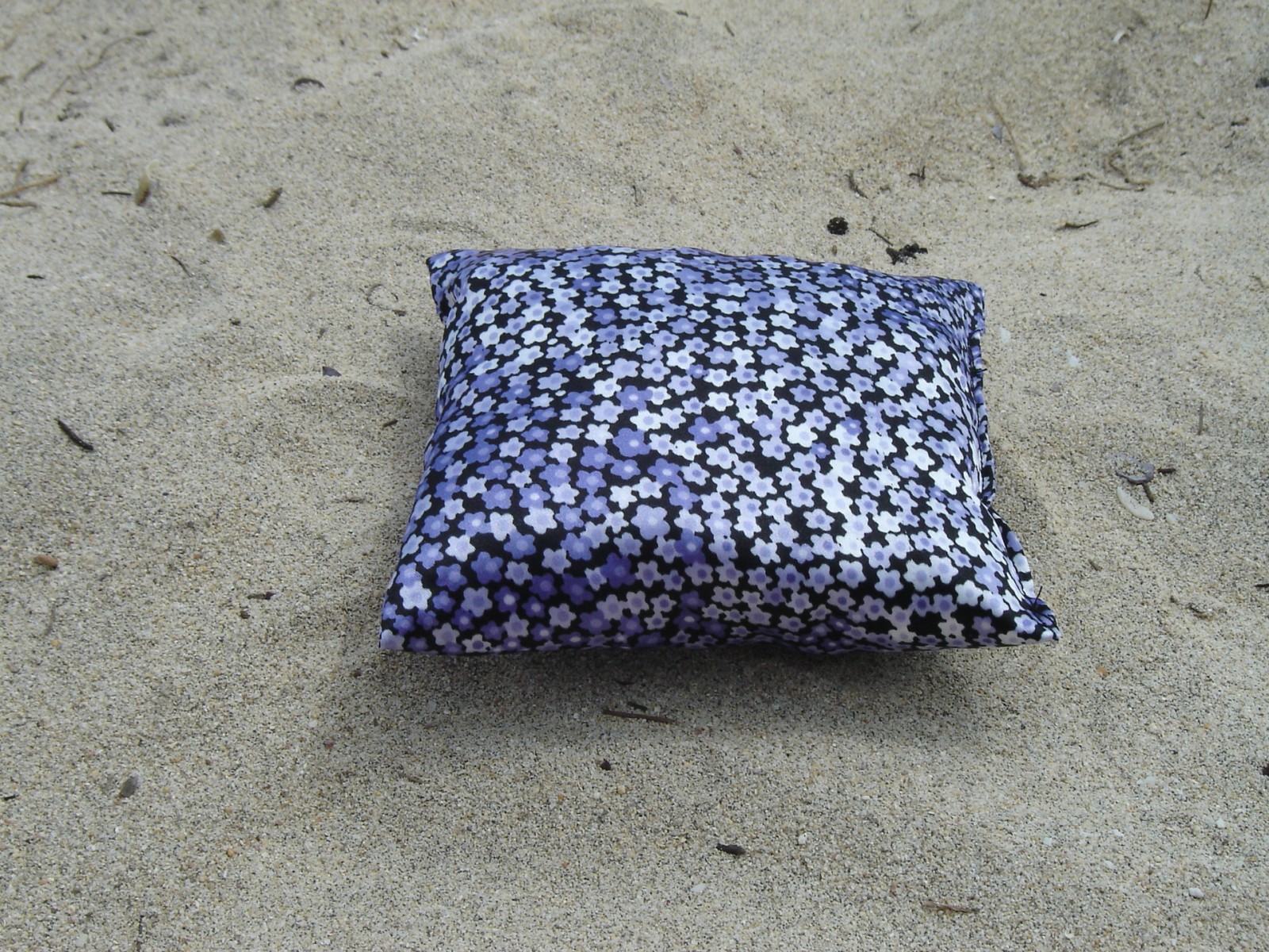 Adorable petit coussin en satin petites fleurs de couleur mauve, violet sur fond noir. Rembourré en fibre de coton végétal naturel. Lavable à la main tiède sans trop serrer.