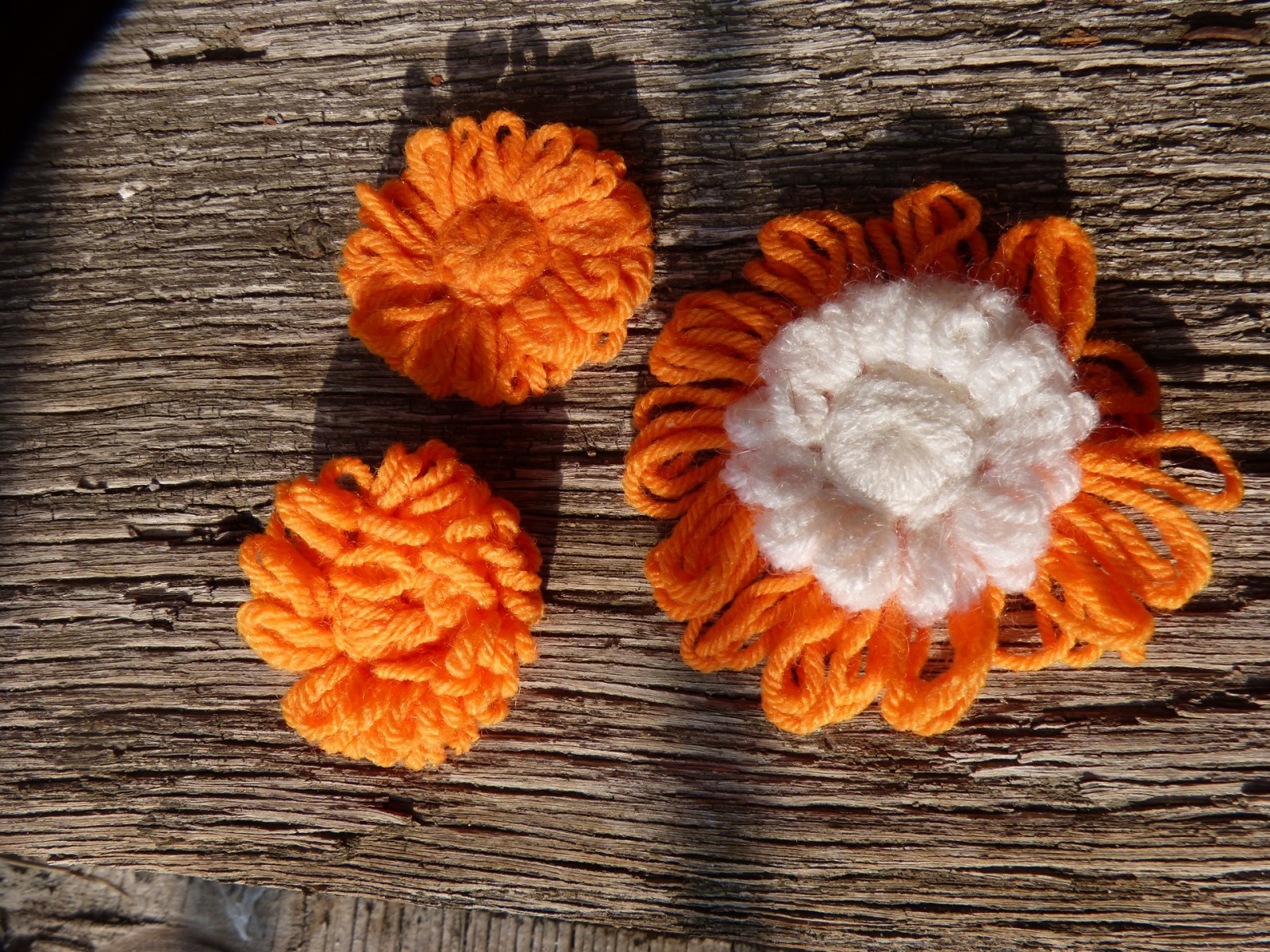 Ce lot se compose d'une grosse fleur de laine acrylique orange de 7,5cmde diamètre avec un coeur blanc de 4,5cm de diamètre, et de 2 petites fleurs de 4,5cm de diamètre couleur orange. Une idée originale pour décorer un rideau, coudre sur un pull, un bonnet, sur un vêtement, un sac. Lavable à 30°. Deux lots disponibles