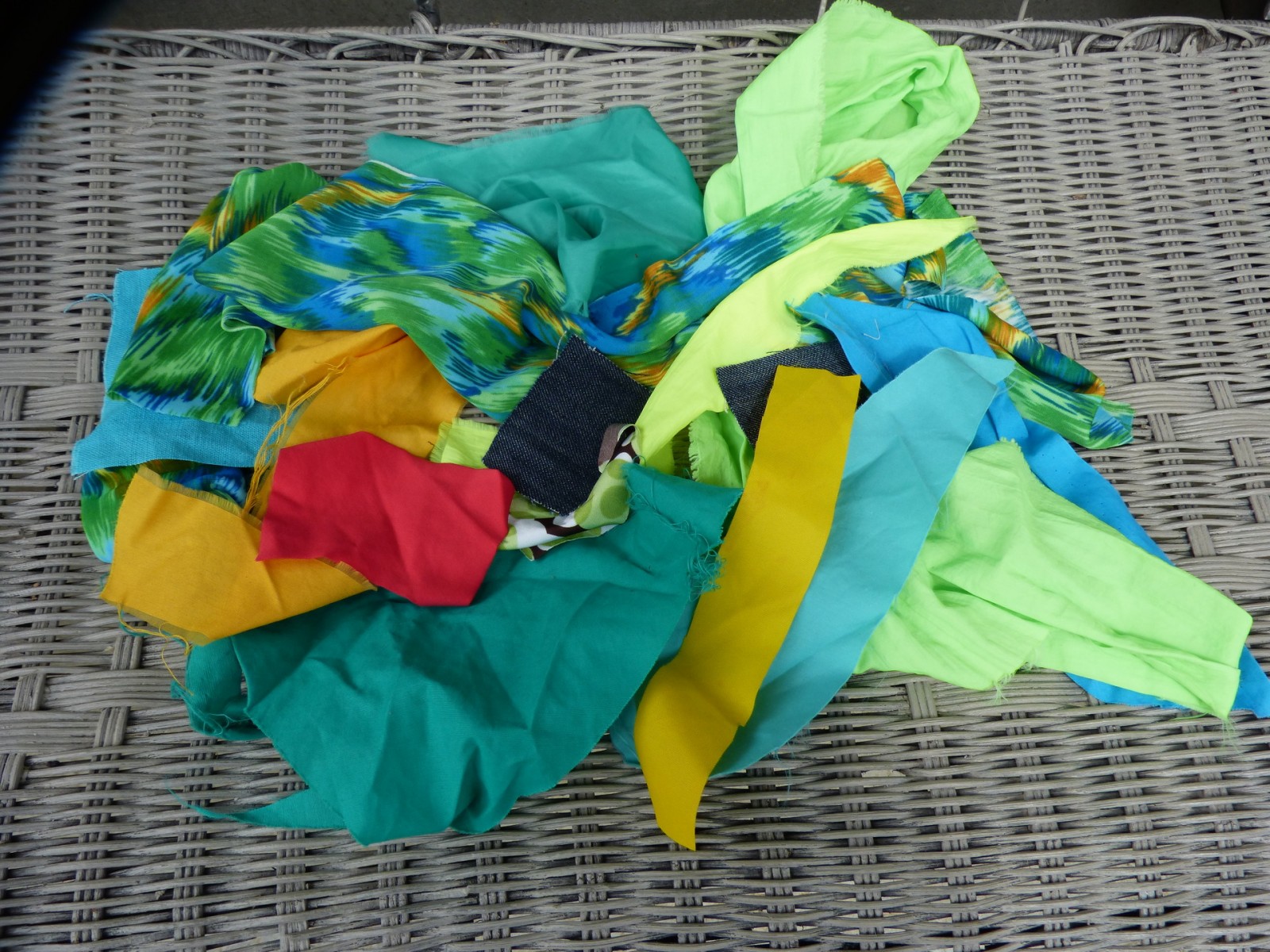 Ce lot de chutes de tissu contient 15 morceaux de tissu dont 2 morceaux de lycra imprimé vert et jaune: le plus long fait 74cm x 20cm, 2 petits morceaux de tissu jaune d'or genre tissu de sport gortex , 3 morceaux de tissu vert en nylon, 1 petit morceau de turquoise tissu de sport, une longue bande de 112cm x 12 cm environ, de tissu vert fluo en nylon froissé. Un petit morceau de lycra rouge, 2 petits carrés de jean, un petit triangle de lycra imprimé vert, marron et blanc, un petit carré de lin turquoise. Si vous avez un besoin particulier pour vos créations, n'hésitez pas à me contacter.