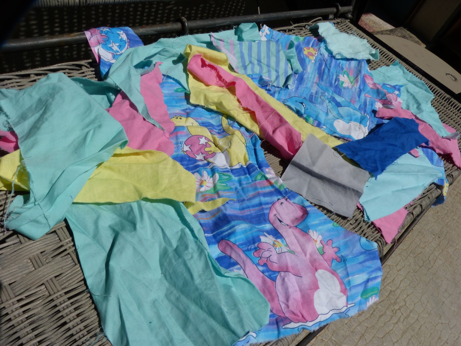 Ce lot se compose de 2 morceaux de tissu 100% coton imprimé bleu turquoise,rose,jaune, vert, avec des ballons, des animaux,et des nénuphars dimension 48cm x 37cm environ. Ensuite vous avez 14 morceaux toujours en coton qui mesurent 14cm x 30cm pour le jaune et le vert pâle, et d'autres mesurent 10 x 10cm. Couleurs jaune, vert pâle, bleu vif, rose, gris clair et un petit morceau rayé pastel vert pâle, bleu et rose. Couleurs résistantes