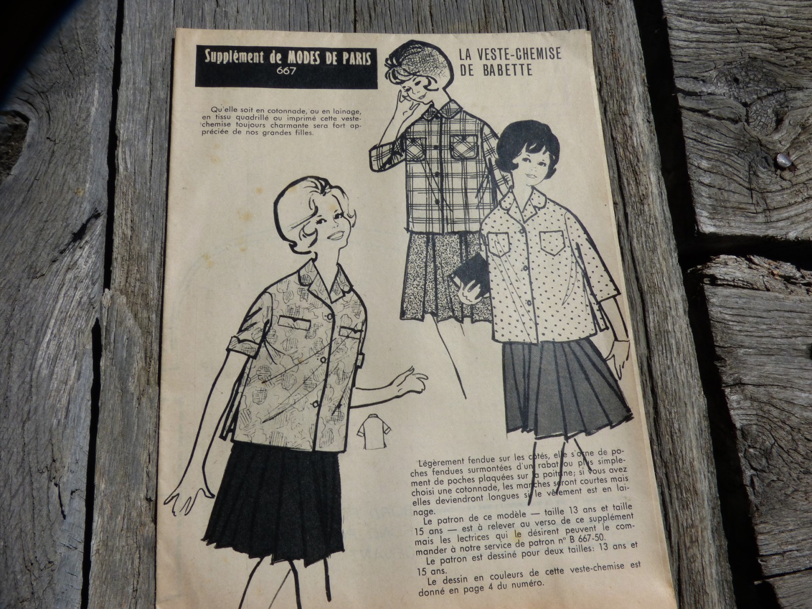 Ce patron est à relever avec du papier transparent. Il vous guide avec des explications, le plan de coupe et des croquis d'assemblage. Cette veste- chemise a une forme droite boutonnée devant avec un col rond ou un col genre veste de tailleur. Trois formes de poches poitrine sont proposées. Vous pouvez choisir des manches courtes ou trois quart. Le patron déplié mesure 80cm x 55cm.