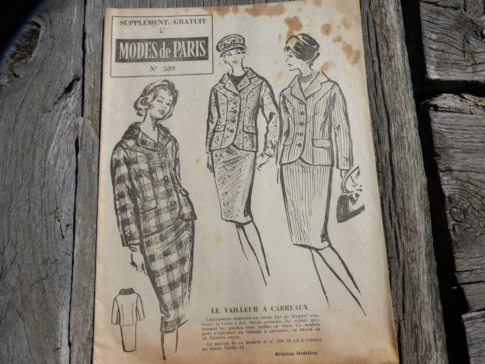 Ce patron est à relever avec du papier transparent. Il vous guide avec des explications, un plan de coupe, des croquis d'assemblage, conseils d'achat du tissu: ici lainage, flanelle ou tweed. La jupe est droite, jupe en forme avec pinces et sans ceinture. La veste est légèrement cintrée, bords arrondis devant et découpes. Col tailleur, manches longues, poches avec rabats coupés dans le biais. La veste est doublée. Pour couturière expérimentée. Dimension du patron déplié: 80cm x 56cm.