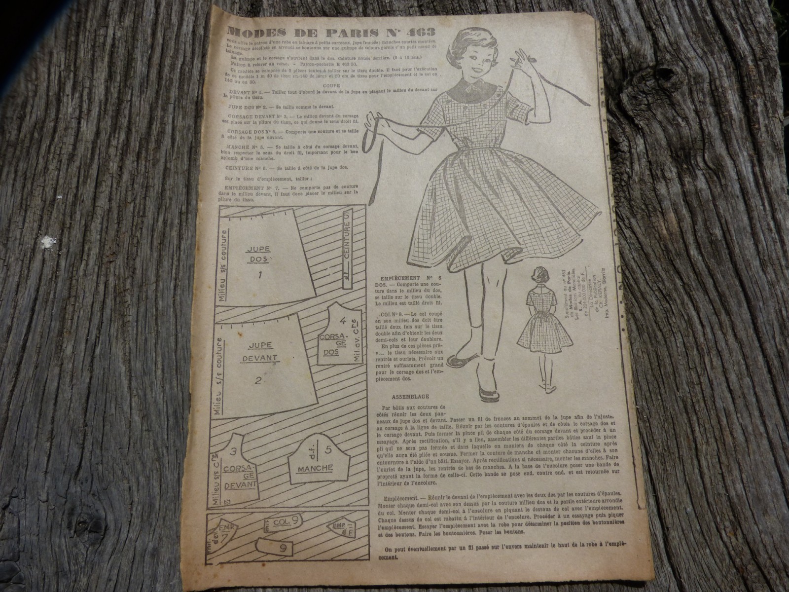 Ce patron est à relever avec du papier transparent. Il vous guide avec des explications et le plan de coupe. Cette robe pour fillette de 8 ans ou 10 ans est un modèle "Modes de Paris" 1954. Le modèle se compose de 9 pièces toutes à tailler sur le tissu double. Il faut 1m40 de tissu en 140 de large et 20cm de tissu pour l'empiècement et le col en 140 ou en 80 de large. La jupe est très froncée à la taille. Il y a une ceinture nouée dans le dos. Manches courtes montées. Corsage col Claudine. La robe s'ouvre dans le dos. Fermeture éclair. Dimension du patron déplié: 56cm x 60cm.