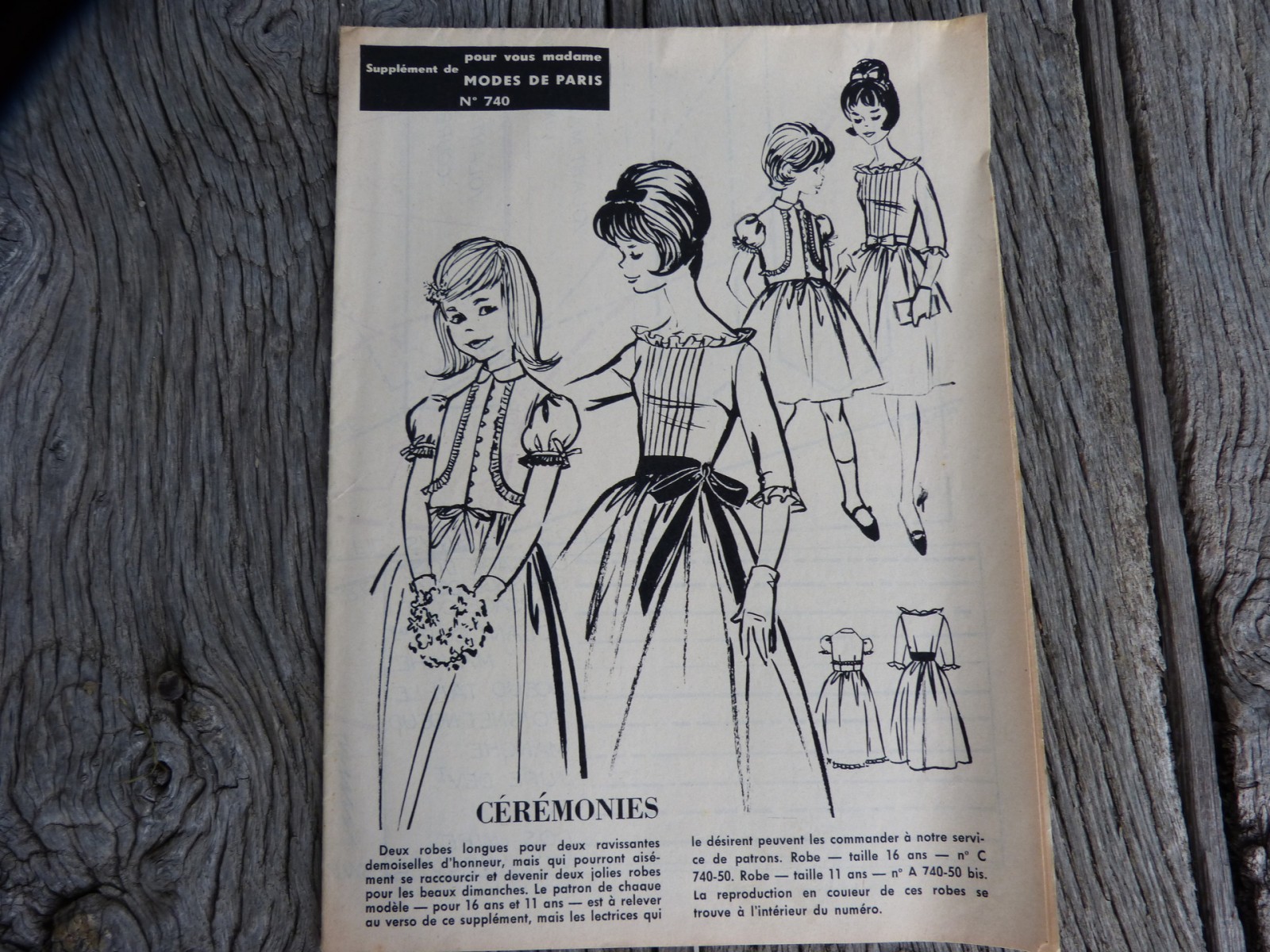 Ce patron est à relever avec du papier transparent; il vous guide avec des explications, le plan de coupe, des croquis d'assemblage. Il vous faut 4m de tissu en 90cm de large pour la robe 16 ans et 3m35 de tissu en 90cm de large pour la robe 11ans. La robe qui a des manches trois quart a des volants au bord de ses manches, ainsi qu'au bord de son encolure qui est de forme bateau. Le corsage a des pinces de poitrine et des pinces verticales de dos. Ce corsage devant est orné de plis couchés. La jupe longue est très froncée à la taille; ceinture nouée en velours . La robe a une fermeture éclair sous le bras. La robe qui a des manches courtes forme ballon, a un col Claudine, une décoration faite d'un faux boutonnage de petits boutons devant et d'un faux boléro avec petit volant. Dimension du patron déplié: 56cm x 80cm