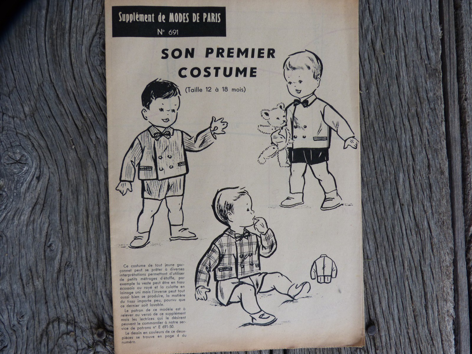 Un petit costume à l'ancienne pour un garçon de 1an et 1an et demi. Ce patron est à relever avec du papier transparent; il vous guide avec des explications, le plan de coupe et des croquis d'assemblage. Pour la veste il vous faut 70cm de tissu en 140 de large et pour le short il vous en faut 35cm.