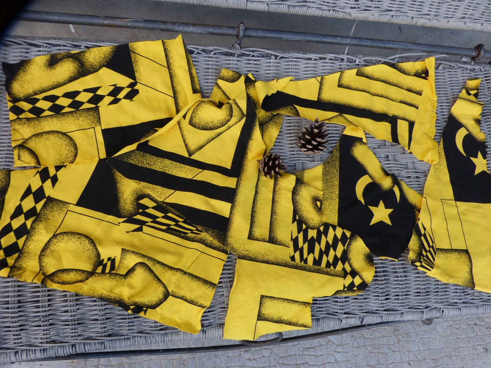 Ce lot de chutes de tissu contient 7 morceaux. C'est un jersey de coton 100% de bonne qualité. Un beau jaune vif imprimé de damiers noirs, de chiffres, d'étoiles et de croissants de lune. l'étoile mesure 5,5cm. Un morceau fait 26cm x 17cm,un fait 42cm x 21cm, deux font 20cm x 14cm, et trois autres font 20cm x 39cm.