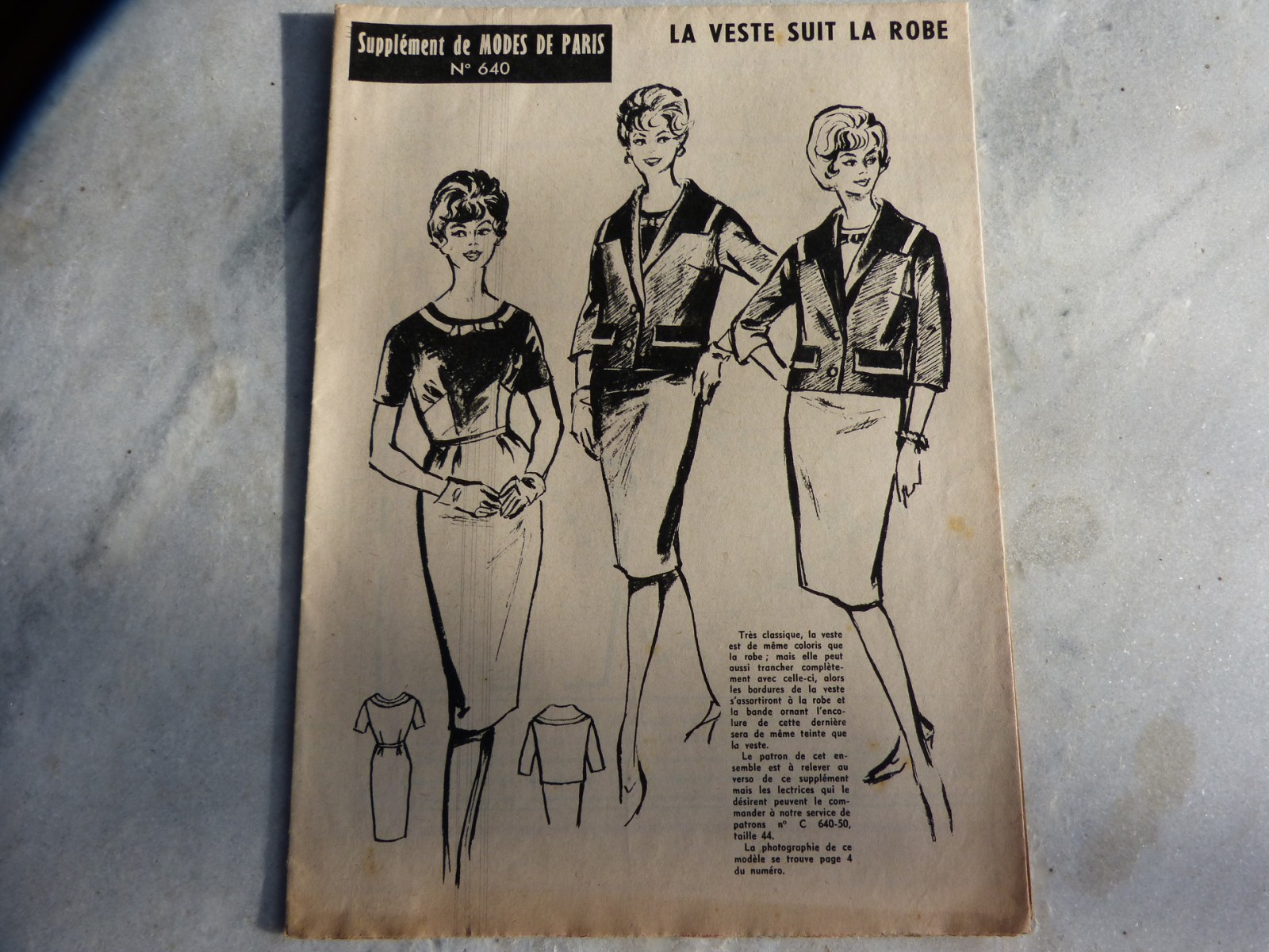 Ce patron est à relever avec du papier transparent; il vous guide avec des explications, des croquis d'assemblage et le plan de coupe. La robe est moulante avec des pinces verticales et pinces de poitrine. Encolure ronde un peu dégagée, avec une bande et un petit noeud. Manches courtes.Fermeture éclair sous le bras. La veste classique a des manches trois quart. Un grand col, des fausses poches à rabats.