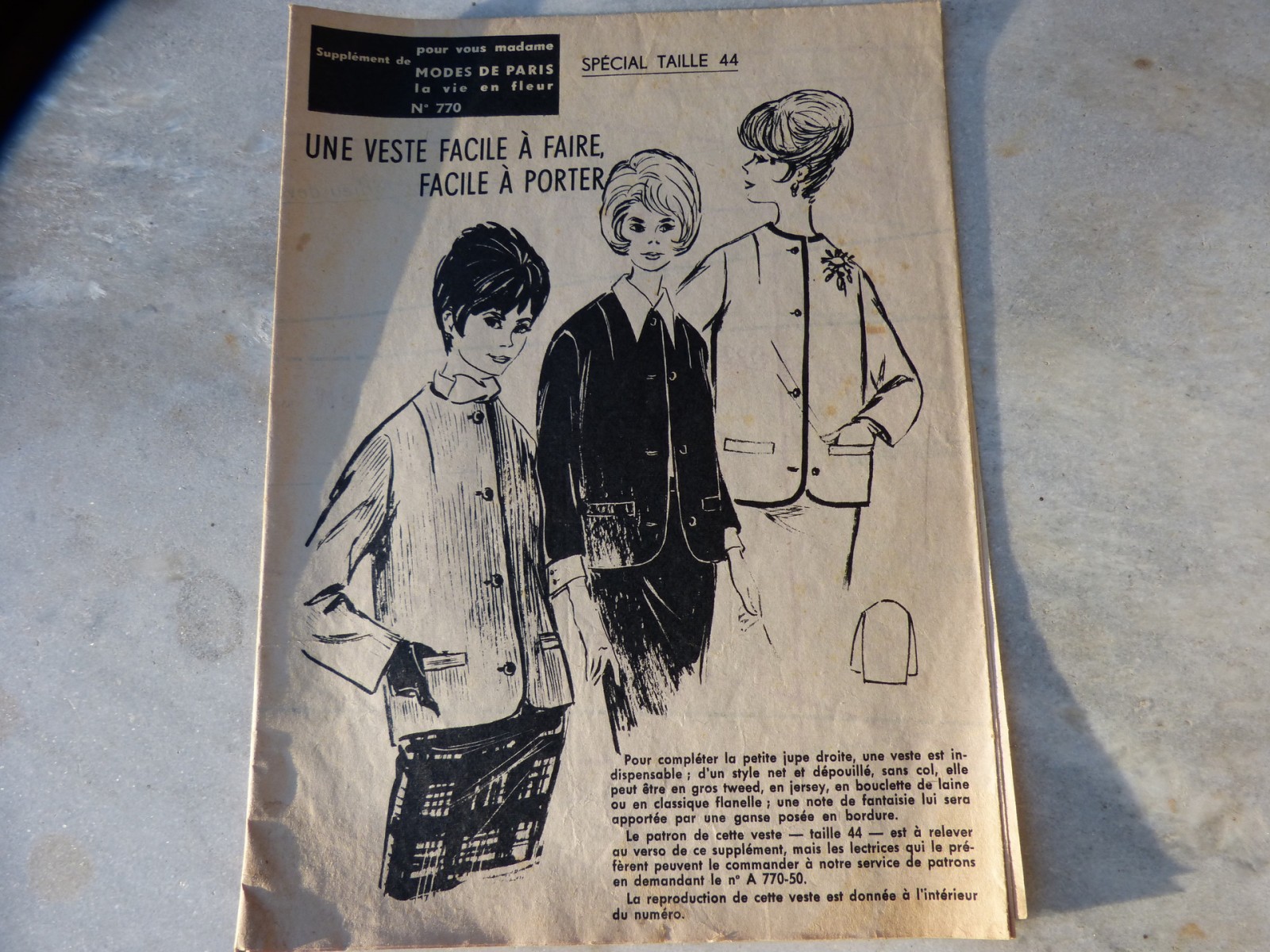 Ce patron est à relever avec du papier transparent; il vous guide pas à pas avec des explications, les croquis d'assemblage et le plan de coupe. D'un style net et sobre, cette veste n'a pas de col, l'encolure est ras du cou avec une finition par un biais ou la doublure. Manches longues montées. Poches avec pattes. Pinces sur les épaules. Le bas de la veste est arrondi au milieu. Tissu conseillé: gros tweed, jersey, bouclette de laine, flanelle. Métrage 1m70 en 140 de large.