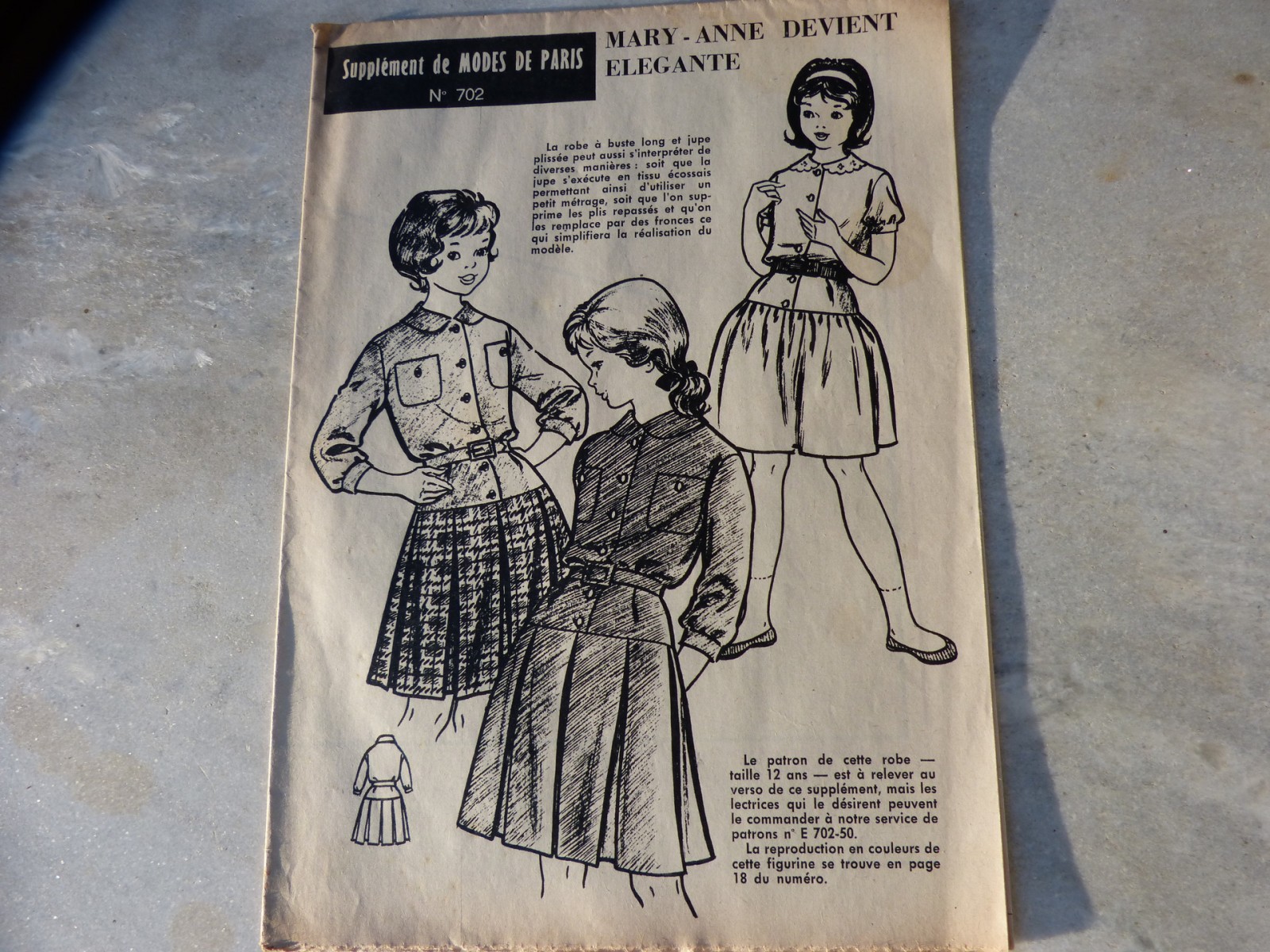 Cette jolie robe donne un effet de jupe plus chemisier. Ce patron est à relever avec du papier transparent; il vous guide avec des explications, le plan de coupe et des croquis d'assemblage. La partie haute est boutonnée devant, vous choisirez si vous coupez des manches ballon ou manches trois quart, col Claudine. La jupe a des plis creux repassés, la taille est marquée par une ceinture. Le modèle n°3 a une jupe froncée. Métrage 2m40 en 140 de large.