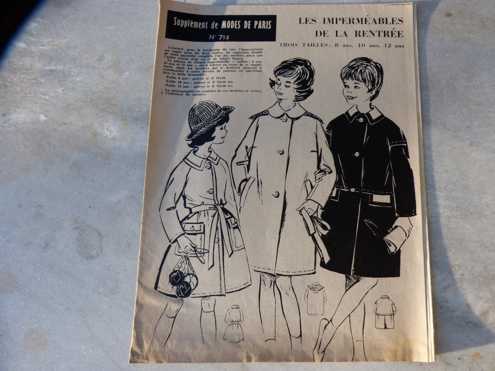 à couper dans de la toile cirée ou des tissus enduits modernes cet imperméable a des manches raglan et une ceinture en t 8 ans, un col, pas de capuche. En 10 ans il a une capuche, des manches montées, des poches en biais. En 12 ans il a une autre forme d'emmanchures, et les rabats de poches sont pris dans une couture horizontale surpiquée. Le patron est à relever avec du papier transparent, il vous guide avec des explications, un plan de coupe et les croquis d'assemblage. Pour une t 8 ans il vous faut 1m65 de popeline de nylon en 150 de large.