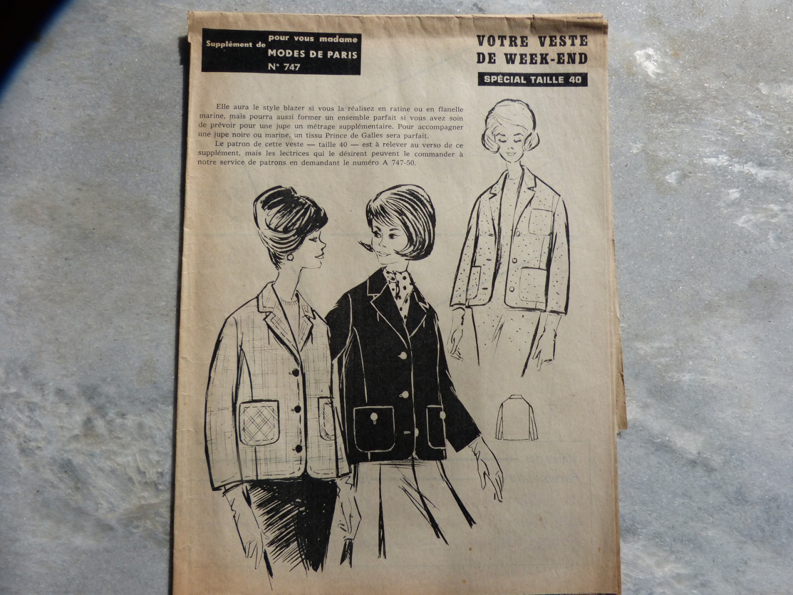 Ce patron est à relever avec du papier transparent; il vous guide avec des explications, le plan de coupe et des croquis d'assemblage. La veste a un col tailleur, des manches montées, des pinces devant les épaules, des découpe de poitrine et des poches plaquées de forme arrondie; cette veste a une forme droite et elle arrive sur le haut du bassin. Prévoir un tissu nylon ou satin pour la doublure.