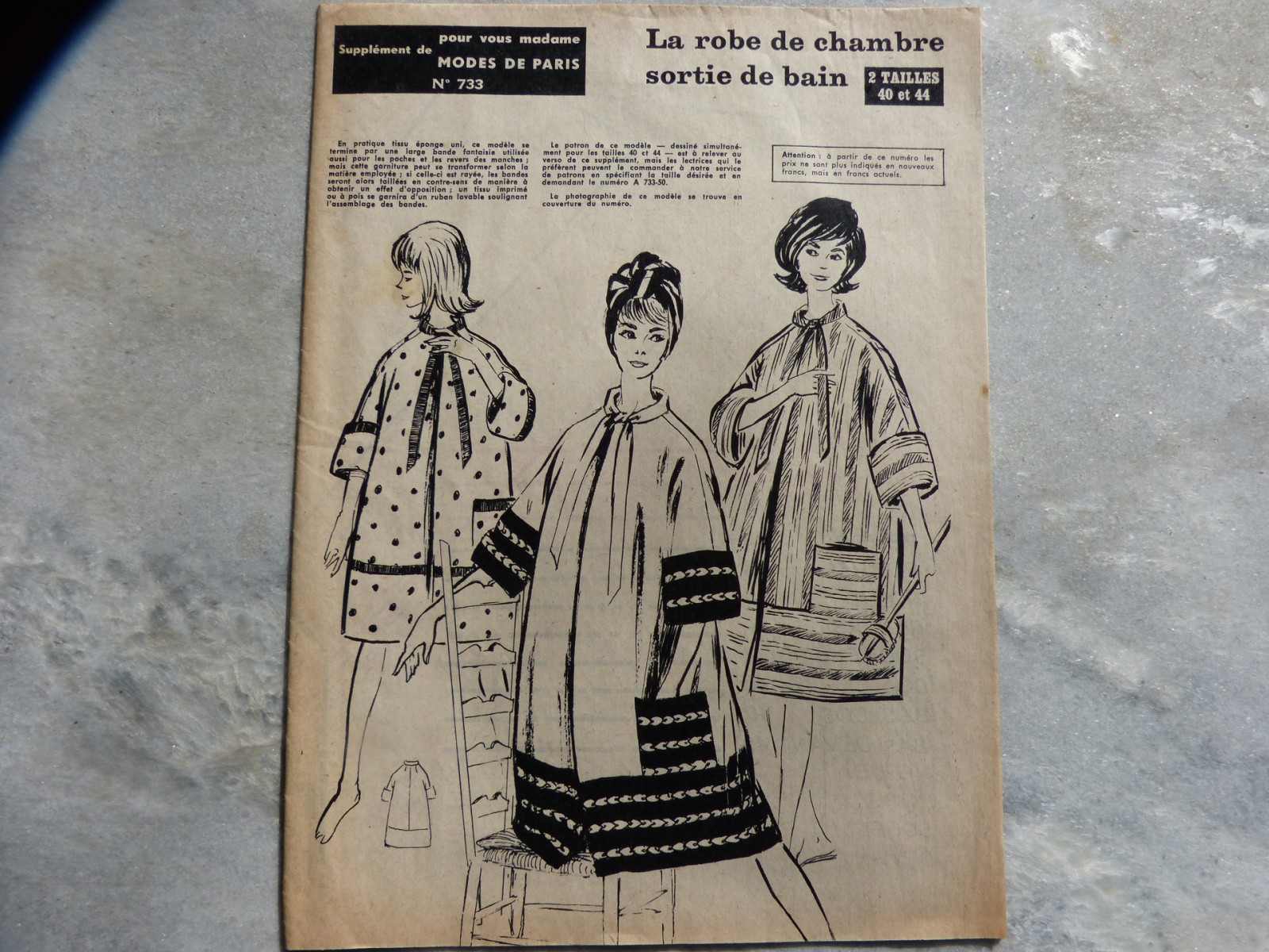 Cette sortie de bain sera assez facile à coudre. Le patron est à relever avec du papier transparent; il vous guide avec des explications, des croquis d'assemblage, le plan de coupe. Ce peignoir a des manches genre kimono mais avec des coutures sur les épaules; larges revers au bas des manches en tissu contrasté et large bande décorative au bas du peignoir. L'encolure se termine par une bande qui se noue pour fermer cette sortie de bain en éponge. Métrage pour une taille 40 il vous faut 1m90 de tissu uni en 140 de large et 1m10 en 140 de large de tissu fantaisie coordonné pour les décorations.