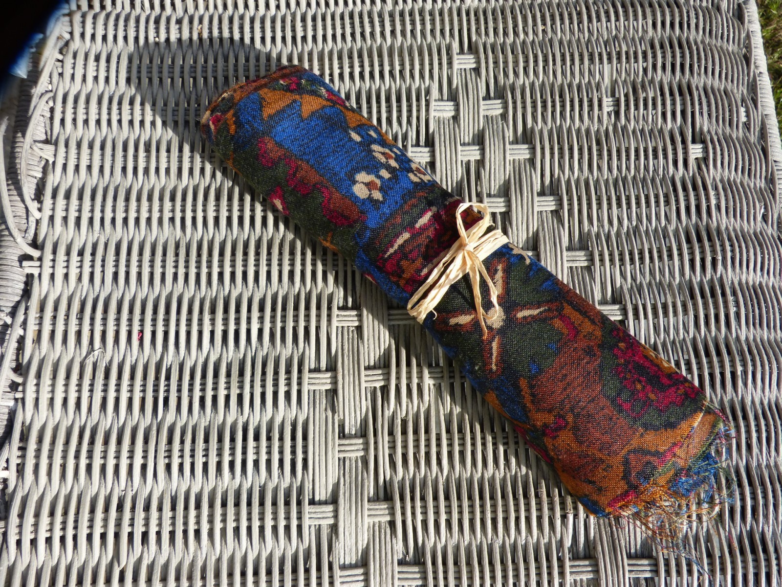 Cinq morceaux de tissu synthétique identiques un peu laineux assez fin; ce sont des chutes de confection. Dimension: long 88cm sur la partie la plus longue, 57cm sur la partie la moins longue, largeur 26cm; donc la partie exploitable est surtout 5 rectangles de 26 x 57.