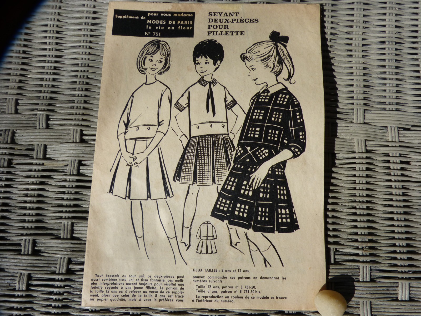 Ce patron est à relever avec du papier transparent; il vous guide avec des explications, des croquis d'assemblage et un plan de coupe. à couper dans du tissu écossais ou uni. La jupe est faite de larges plis tout le tour: les croquis expliquent bien comment mesurer pour les faire; ensuite cette jupe est montée sur une ceinture faite avec un gros grain. La jupe se ferme par une fermeture sur le côté. Le haut se ferme dans le dos avec une fermeture, il a un petit col ou on peut opter pour une encolure sobre ras du cou. Manches trois quart ou courtes. Décoration: une poche sur toute la largeur de ce haut avec trois boutons. Cravate en option.