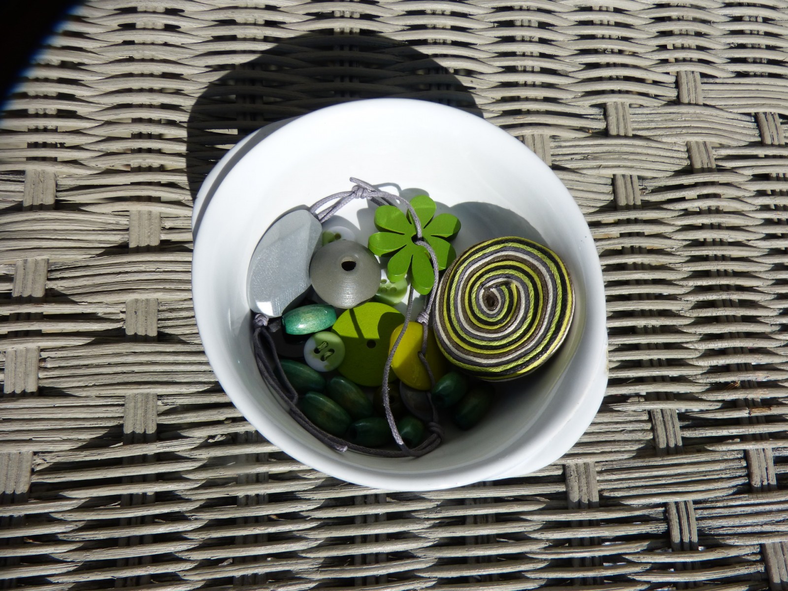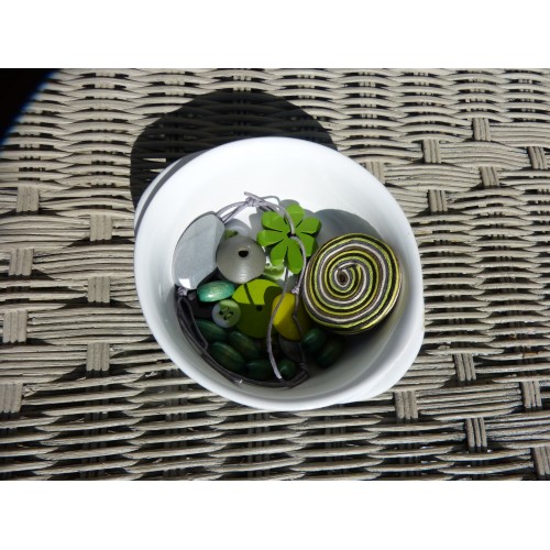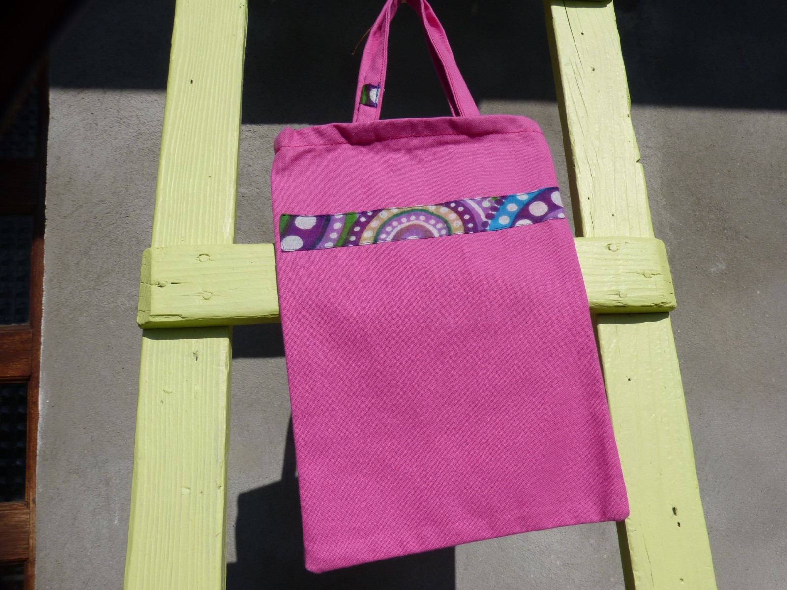 Ce petit sac cabas est en tissu d'ameublement fuchsia 100% coton sur lequel j'ai cousu à la machine une bande de voile de coton imprimé de motifs géométriques verts,bleus,violet,mauve. Pour vous amuser, il vous restera à placer et à coudre des perles, des boutons, fleurs dans une harmonie de verts qui sont joints au cabas. Dimension: haut 30cm x large 22cm, longueur des anses: 29cm, largeur des anses: 1,5cm. Hauteur de la bande tissu imprimé: 3cm. Perles: 10 perles allongées en bois vert, 5 petits boutons en plastique vert clair et blanc, une spirale en cordon dégradé de vert, une fleur en bois vert pré diamètre 3cm, 3 ronds en plastique, 1 rond plus épais en bois vert mat,1 grosse perle allongée à facettes gris satiné, 1 ronde gris plus foncé, 1 petite perle 5mm anthracite brillante.