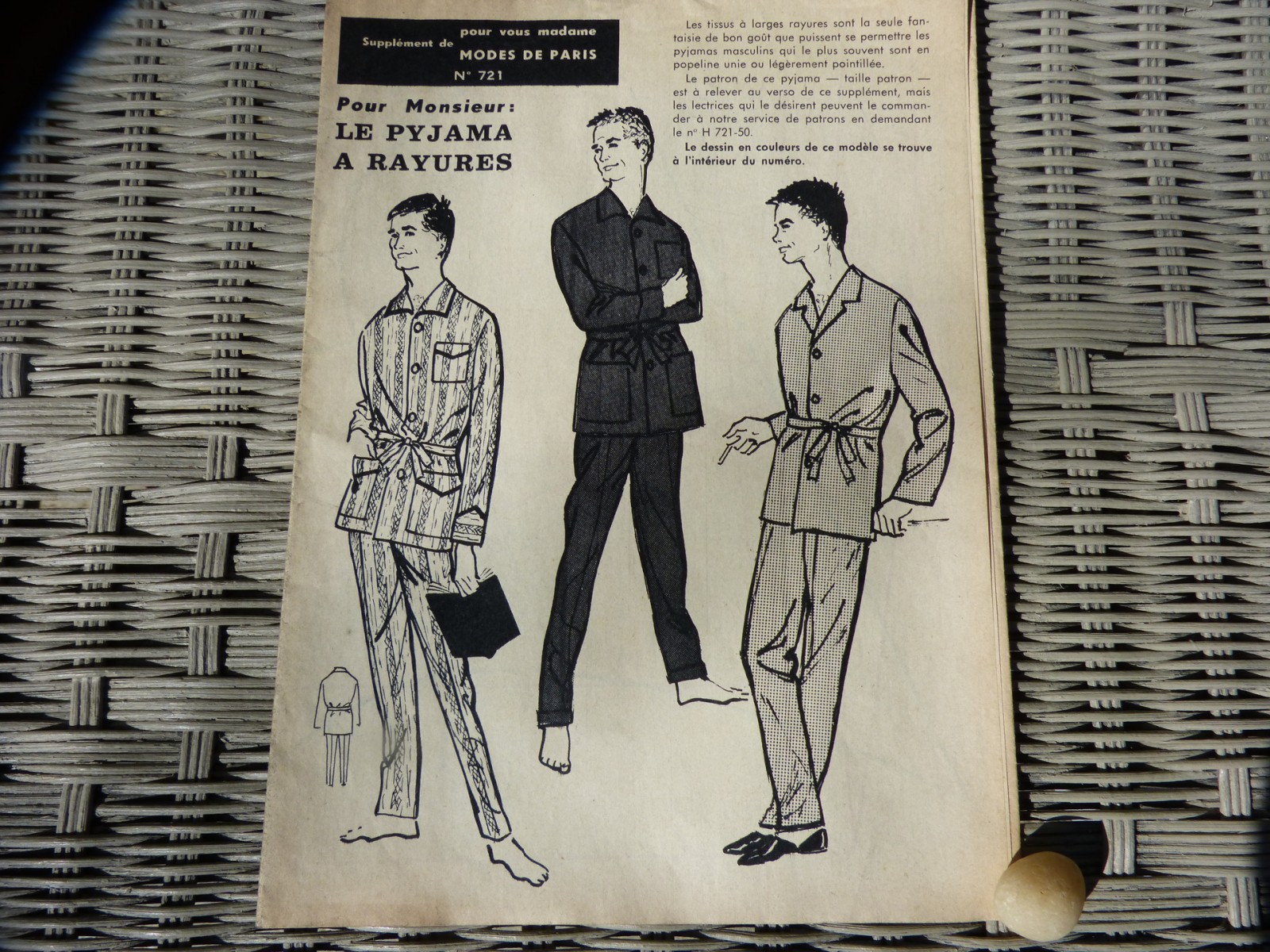Ce patron est à relever avec du papier transparent; il vous guide avec des explications, des croquis d'assemblage et le plan de coupe. Vérifiez les mesures avant de couper. Dans ce patron vous trouverez aussi un modèle de broderie à la main de branche de châtaignier pour napperon ou coussin. Le pantalon de ce pyjama est simple, forme droite avec taille élastique. La veste boutonnée devant est proposée avec ou sans poches et il y a une ceinture. Les manches sont montées; on peut choisir un bas de manche rehaussé d'un passepoile. Col simple ou col cranté comme un blazer.