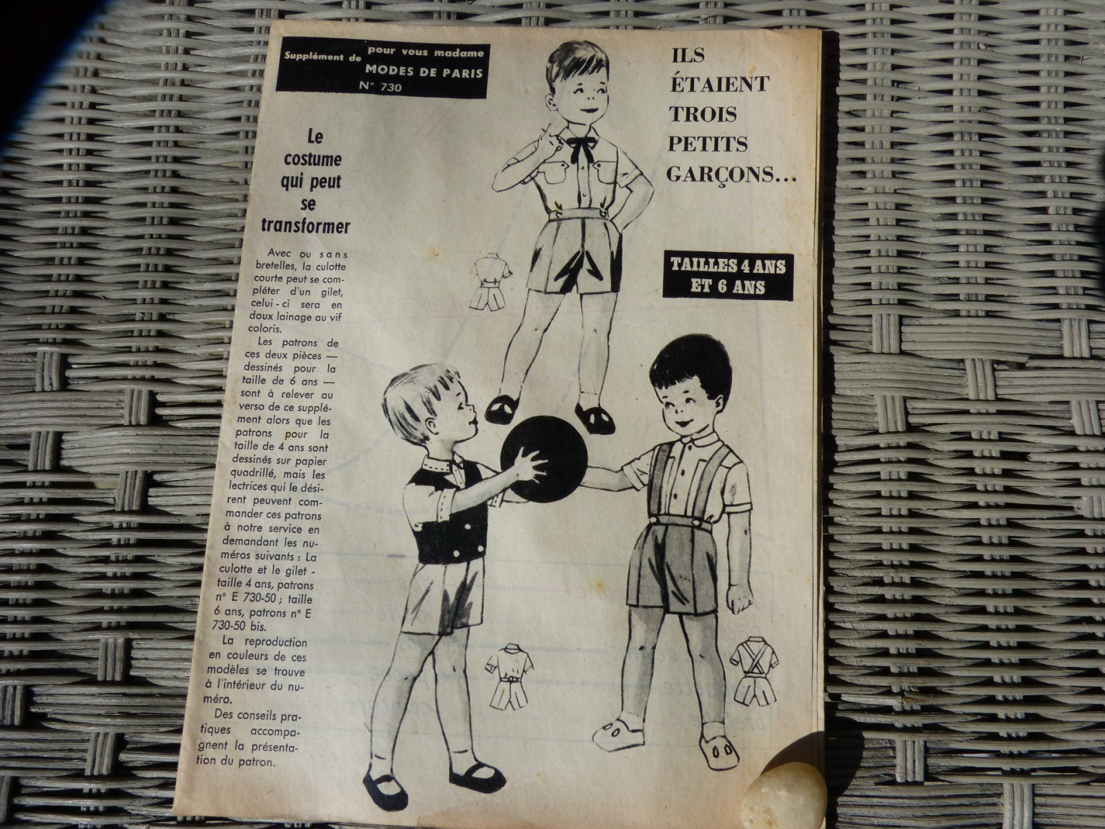 Ce patron vintage est à relever avec du papier transparent; il vous guide avec des explications, des croquis d'assemblage des poches et parementure du gilet, et le plan de coupe. La culotte peut se porter avec ou sans bretelles; il y a des poches, une ceinture, une braguette. On peut transformer ce short en pantalon en mesurant la jambe de l'enfant: il suffit de prolonger les lignes et d'ajouter 4cm pour l'ourlet. Le gilet en lainage ou en beau tissu pour un mariage, a une encolure en v, une forme boutonnage croisé. Il a une parementure; on peut le doubler entièrement si on veut une finition impeccable.