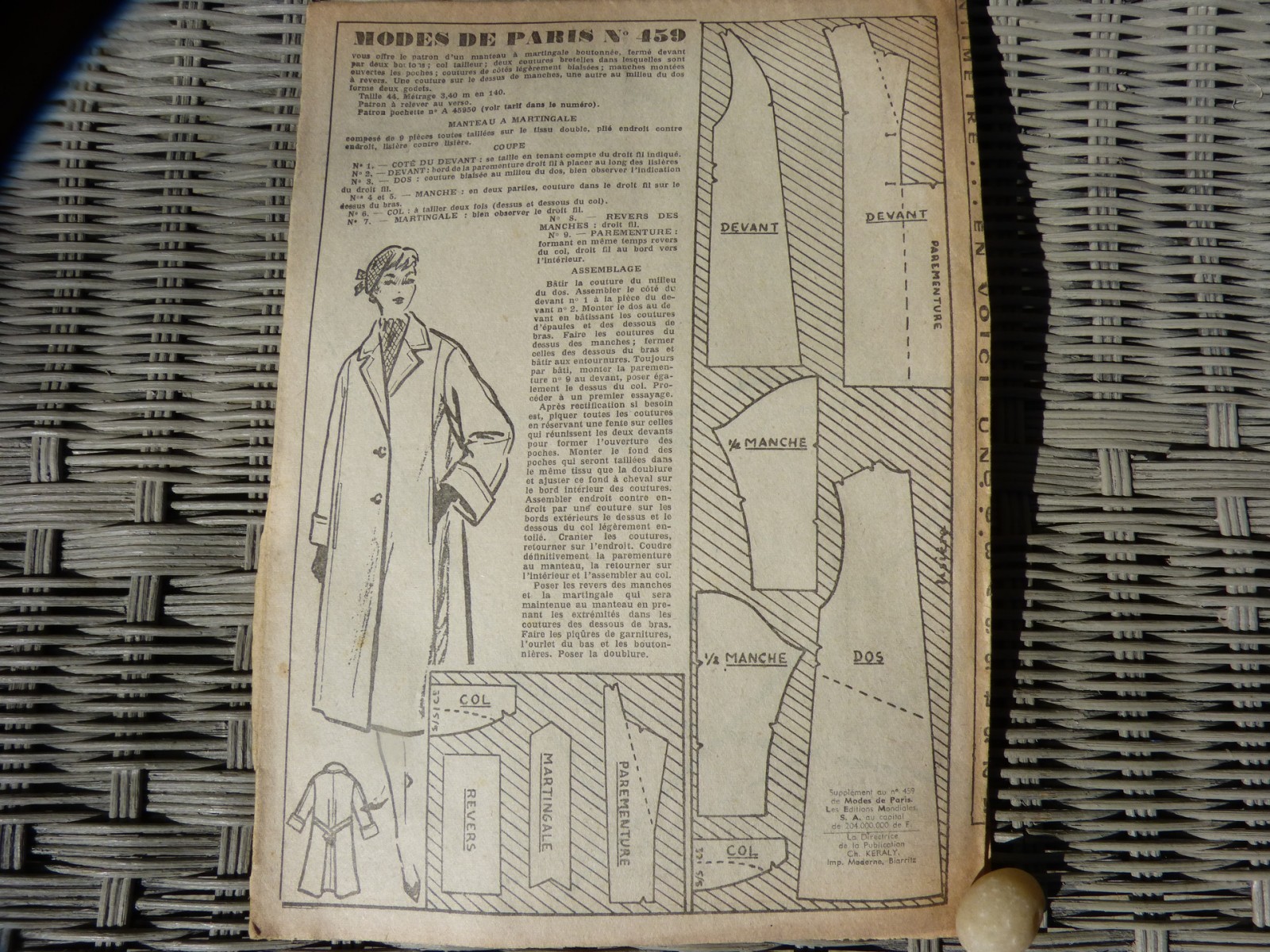 Ce patron année 1955 est à relever avec du papier transparent; il vous guide avec des explications et le plan de coupe. Métrage: 3m40 en 140 de large. Ce manteau a une belle coupe avec son plis creux dans le dos et la martingale. Col tailleur surpiqué, manches larges avec revers. Les poches sont dans les coutures des découpes. Le manteau est fermé par deux boutons. à réaliser dans du lainage, du caban, de la flanelle.