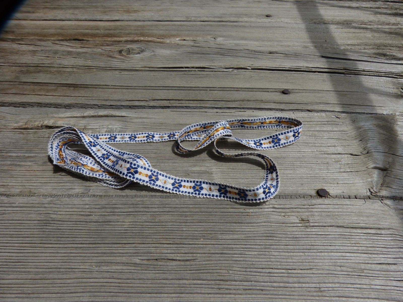 Ce galon en 100% coton souple, est brodé machine. Motif fleurs bleu roi, carré gris clair et points jaunes sur fond blanc: largeur: 1,5cm, longueur: 2m55.