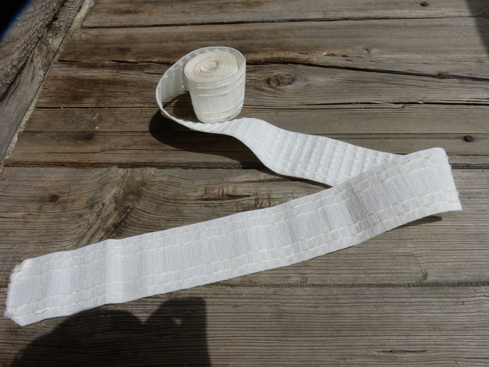 Large ruflette en tissu synthétique blanc assez rigide dans laquelle passent les fils qui servent à froncer le rideau. On peut aussi utiliser cette bande sans la froncer mais juste pour mettre les crochets sur un rideau plat. Largeur: 7cm longueur: 2m02