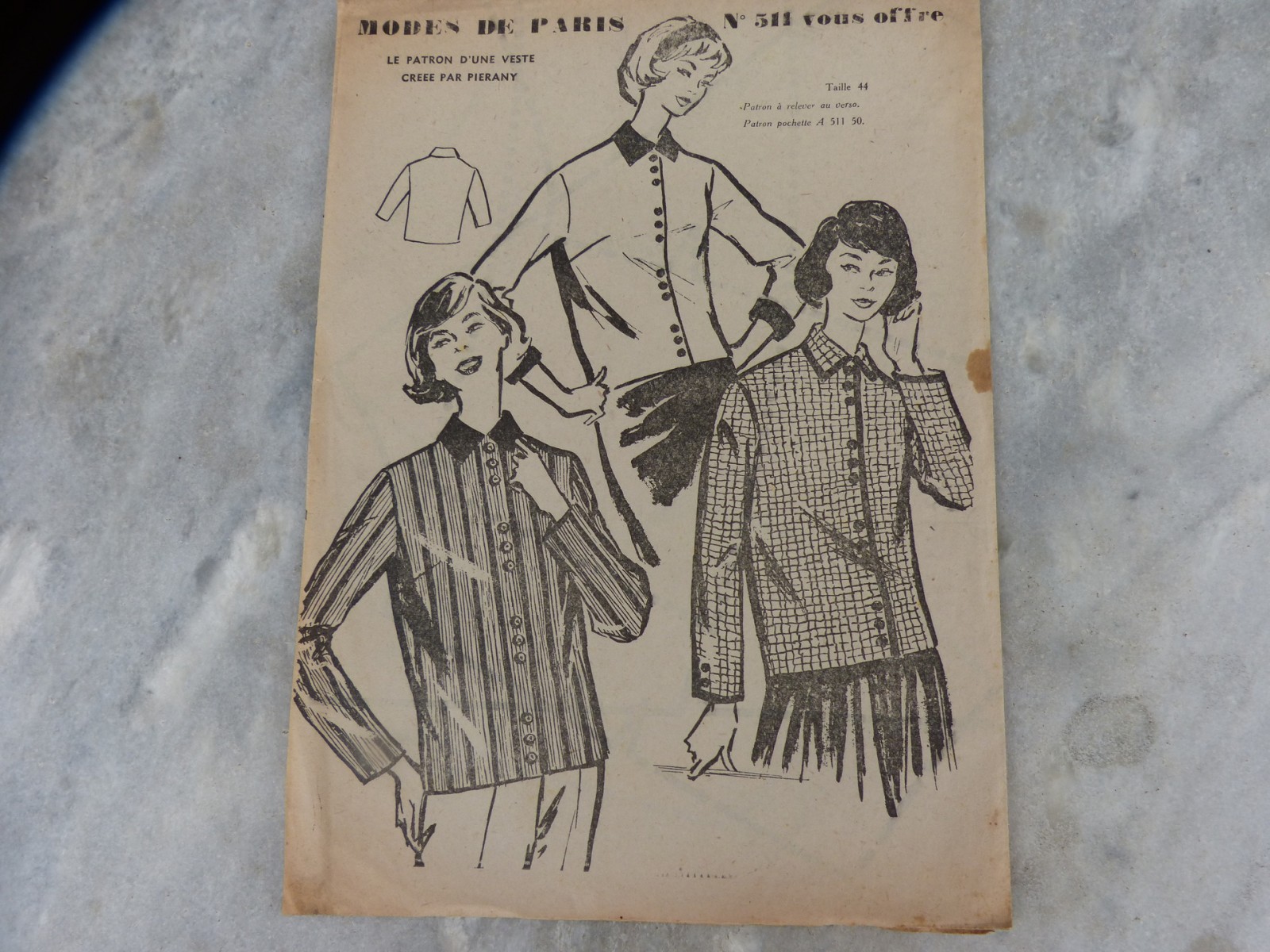 Ce patron est à relever avec du papier transparent; il vous guide avec des explications et le plan de coupe. Ce chemisier est droit, petit col pointu, boutonnage boutons groupés par 3. Pinces de poitrine,boutons décoratifs au bas des manches. Manches montées. Ce chemisier arrive sur le haut du bassin (si vous avez un long buste, je conseille de le rallonger un peu). L'un des modèles est bordé de biais tout le tour. Il faut 1,70m de tissu en 1,40m. Cette veste-chemise sera différente suivant le tissu choisi: toile imprimée ou unie, ou tissu de fête comme de la soie ou du taffetas.