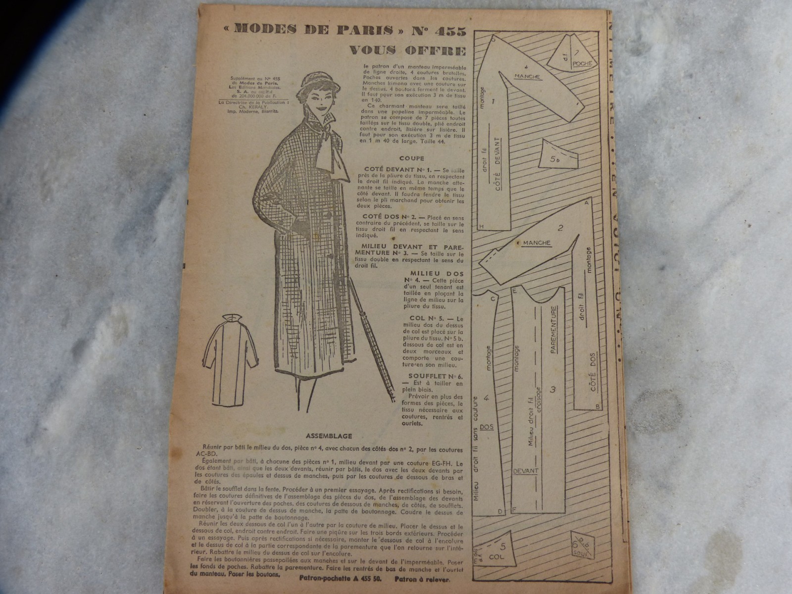 Ce patron est à relever avec du papier transparent; il vous guide avec des explications et le plan de coupe. Utiliser un tissu enduit ou de la toile cirée ou des tissus sport comme le Goretex qui laisse respirer. Cet imperméable a un col assez large, des manches kimono avec une couture sur le dessus du bras, des découpes devant et dos. Poches dans les découpes devant, boutonnage. Le manteau est doublé. Patron et explication croquis du petit chapeau cloche. Métrage 3m de tissu en 1m40 de large.