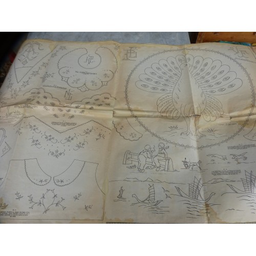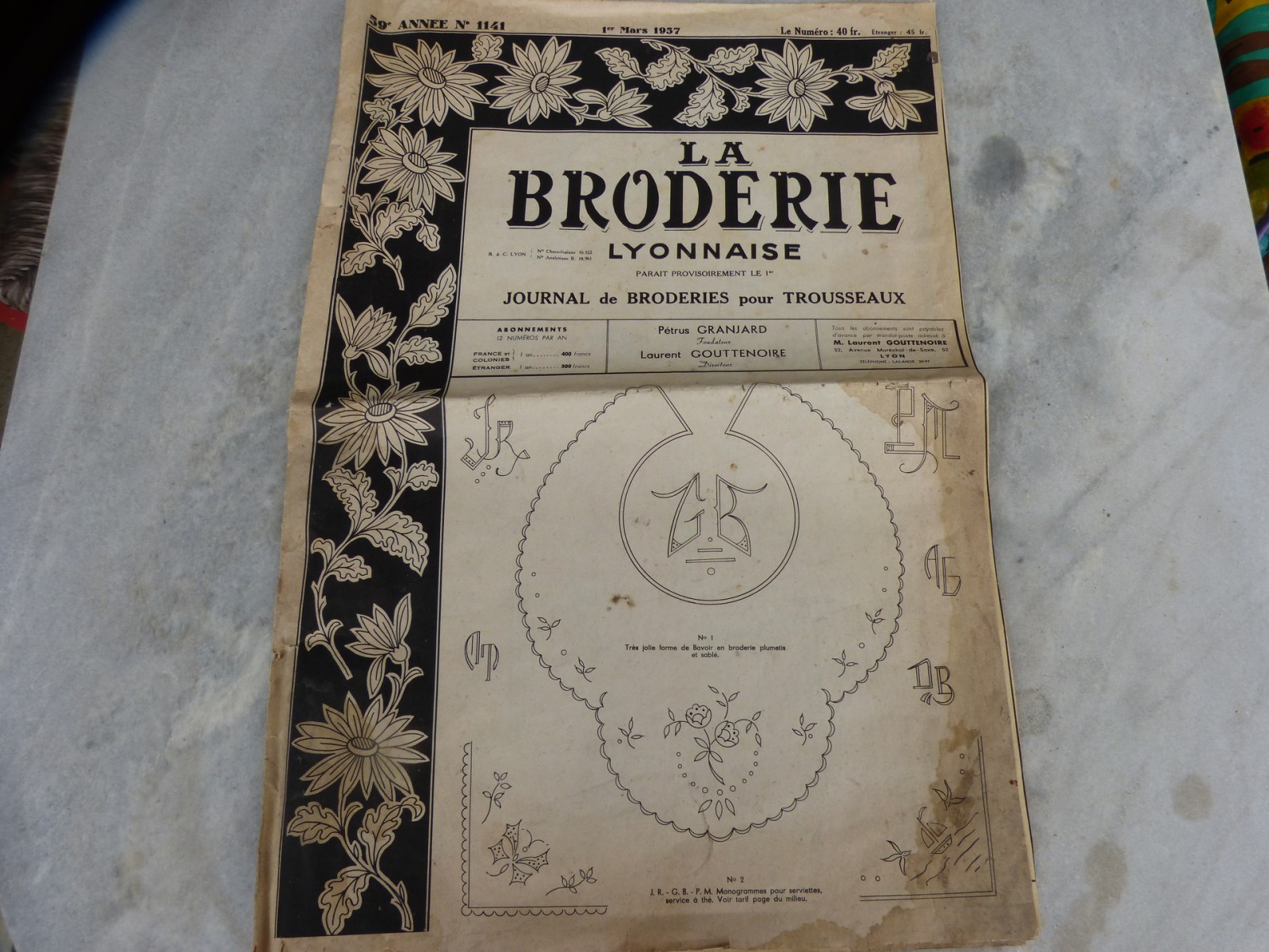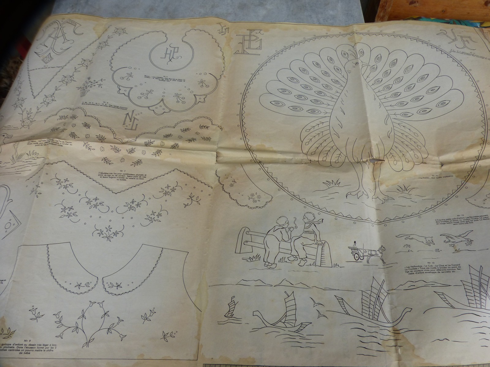 Cette grande feuille "La broderie Lyonnaise" dépliée mesure 95cm x 63cm; on y trouve au recto: un abécédaire de grandes lettres qui étaient brodées à la main sur les draps en lin, dimension des lettres: environs 10cm; il y a plusieurs modèles tailles et graphisme de lettres. Un modèle patron de bavoir brodé en 1ère page. Au verso on découvre un autre modèle de bavoir, un modèle de broderie pour chemise de nuit, un paon à broder dans un cercle de 40cm de diamètre et les explications pour le réaliser. Il y a aussi des modèles de bateaux à broder pour un drap d'enfant. Une calèche avec un cheval, un chat, un canard, un cycliste etc. Ce patron est un peu abîmé par le temps aux pliures mais c'est le seul que je possède, je pense qu'il peut intéresser des personnes, costumiers, historiens, nostalgiques!