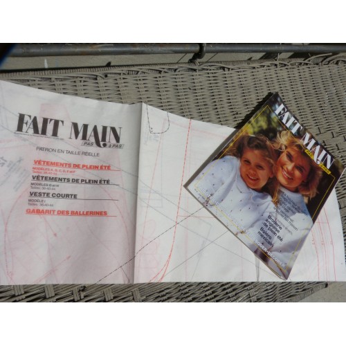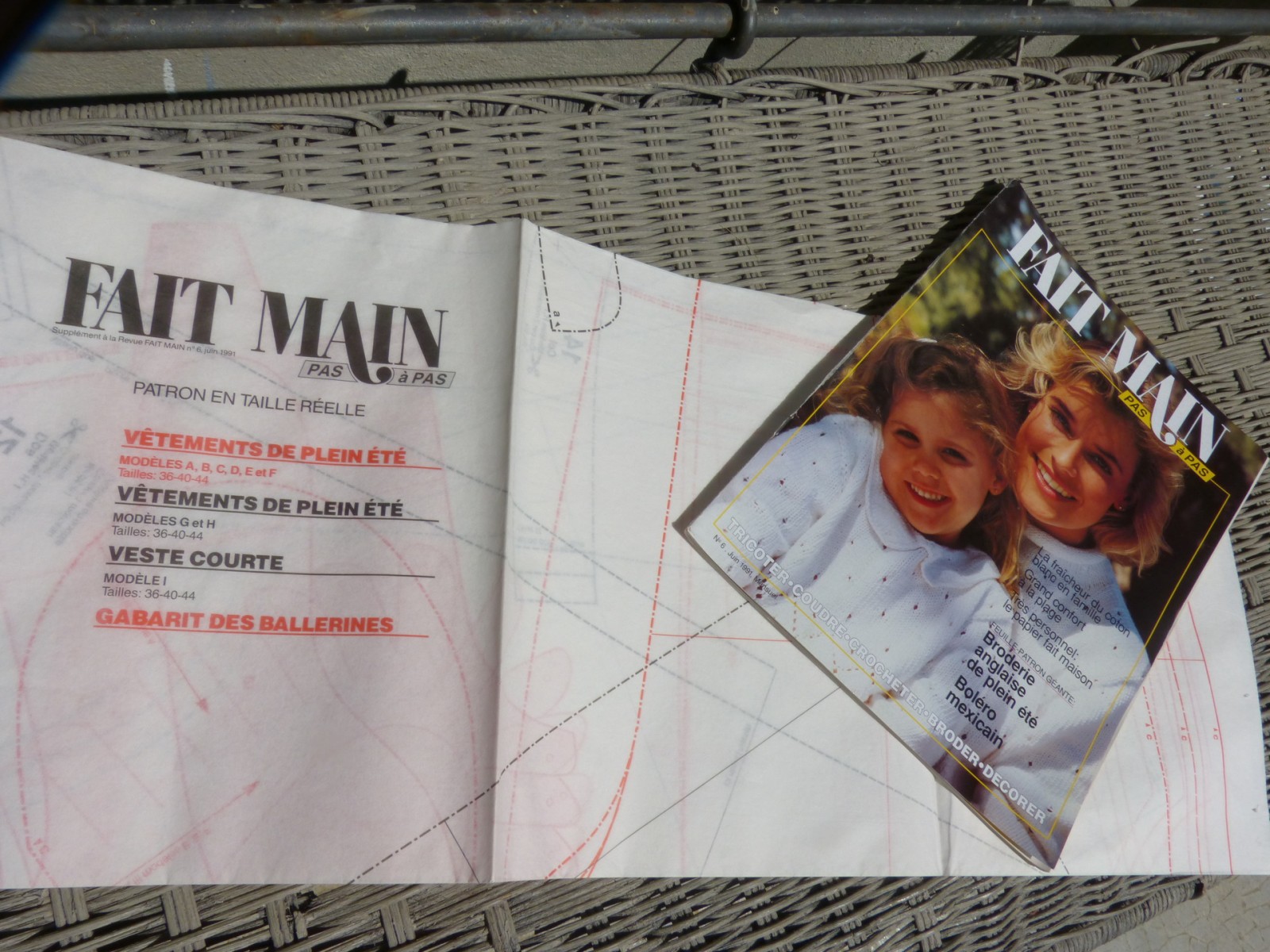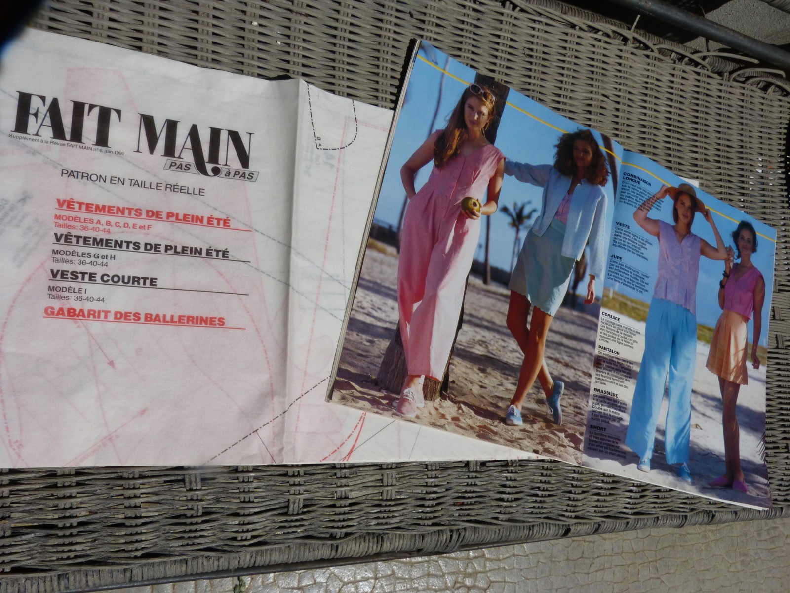 Ce magazine de 59 pages en couleur est plein d'idées et de patrons ou modèles avec toutes les explications pour les réaliser. Pas de publicité. J'ai mis l'accent sur une adorable panoplie de vêtements légers en broderie Anglaise du 36 au 44: pantalon, jupe, veste etc avec les patrons à relever sur la grande feuille patron. Modèles de pulls blancs pour toute la famille. Des coussins avec des motifs fruits à appliquer en tissu. Faire de l'aquarelle sur soie. Et faire un beau paravent de plage en toile rayée.