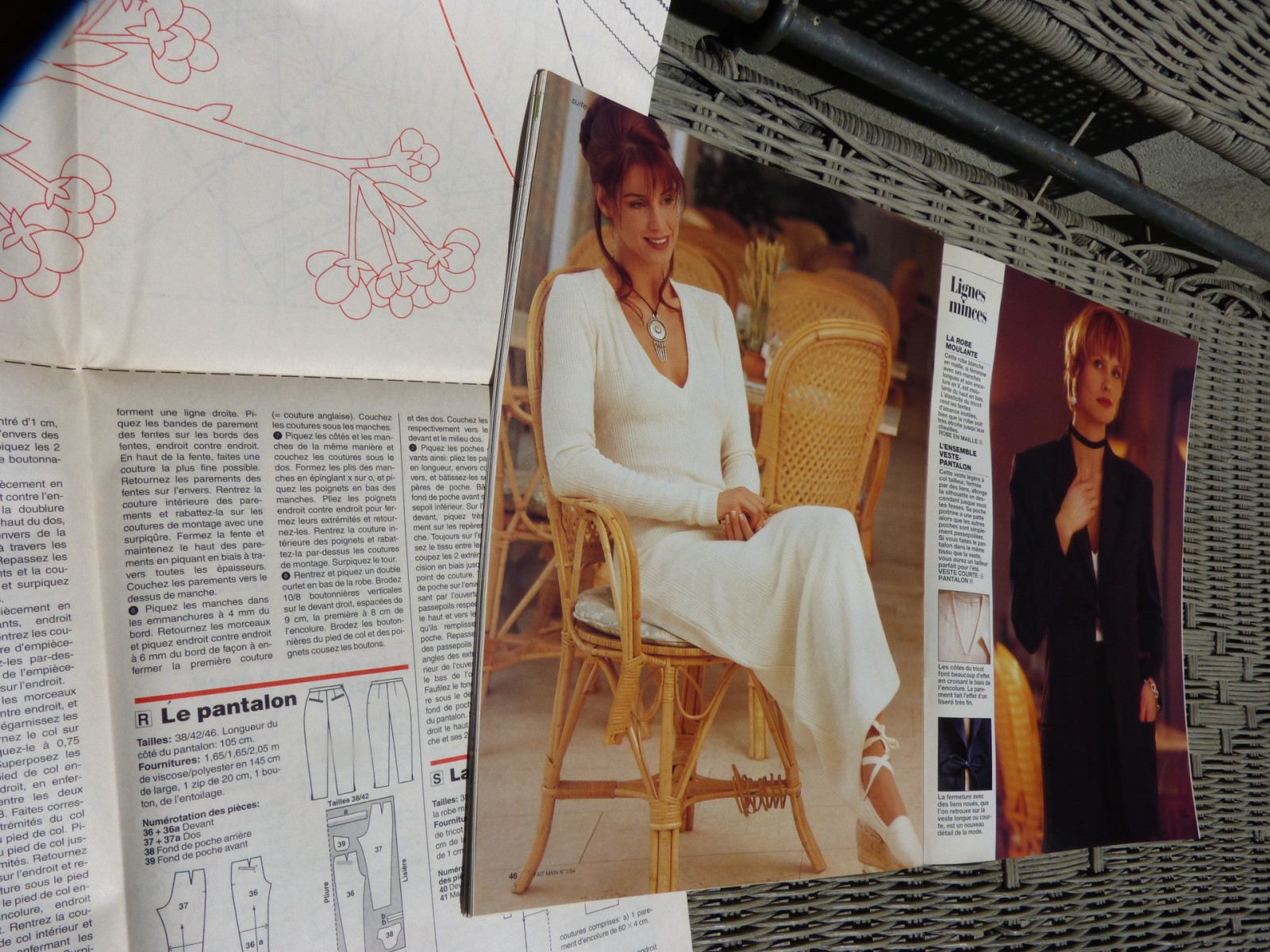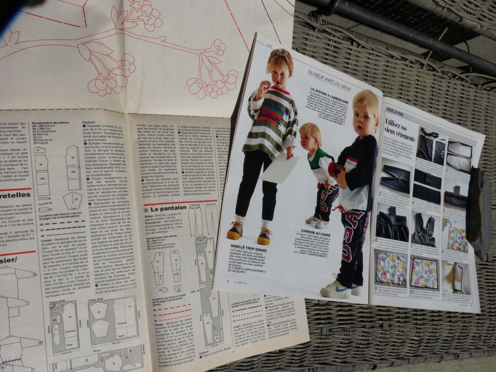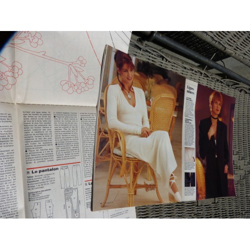 Magazine de 59 pages en couleur et grande feuille patron et toutes les explications pour coudre des pantalons, sweet shirt, tee shirt pour les enfants de 1 an à 6 ans à couper dans de vieux vêtements de papa et maman; il y a aussi un jogging et une petite salopette en tissu jogging avec l'explication pas à pas. D'autres modèles pour femme comme le robe longue en maille écru et de belles vestes tailleur. Faire des boites en carton ondulé, un coussin brodé.