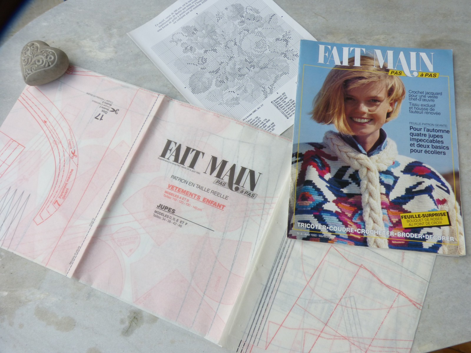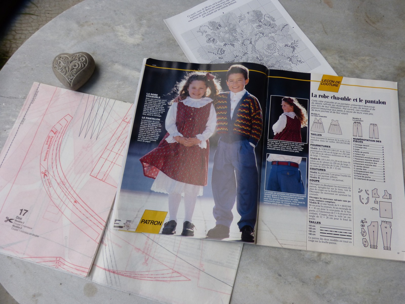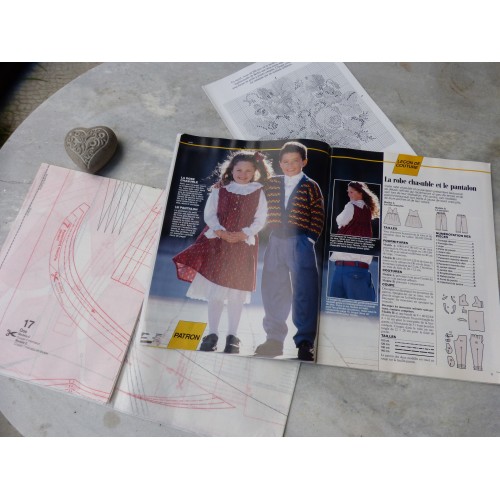 Magazine tout en couleur avec sa grande feuille patron et explications pour coudre vêtements adultes et enfants. Modèles de pulls. Dans ce numéro patrons de robe et de pantalon tailles 4,6,8 et 10 ans. Jupes adultes. Explications pour recouvrir un fauteuil ancien. Et encore bien des choses!