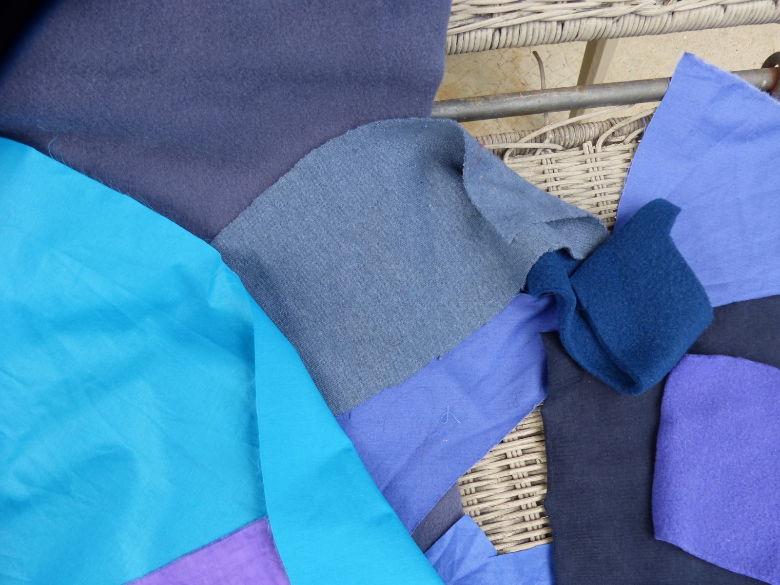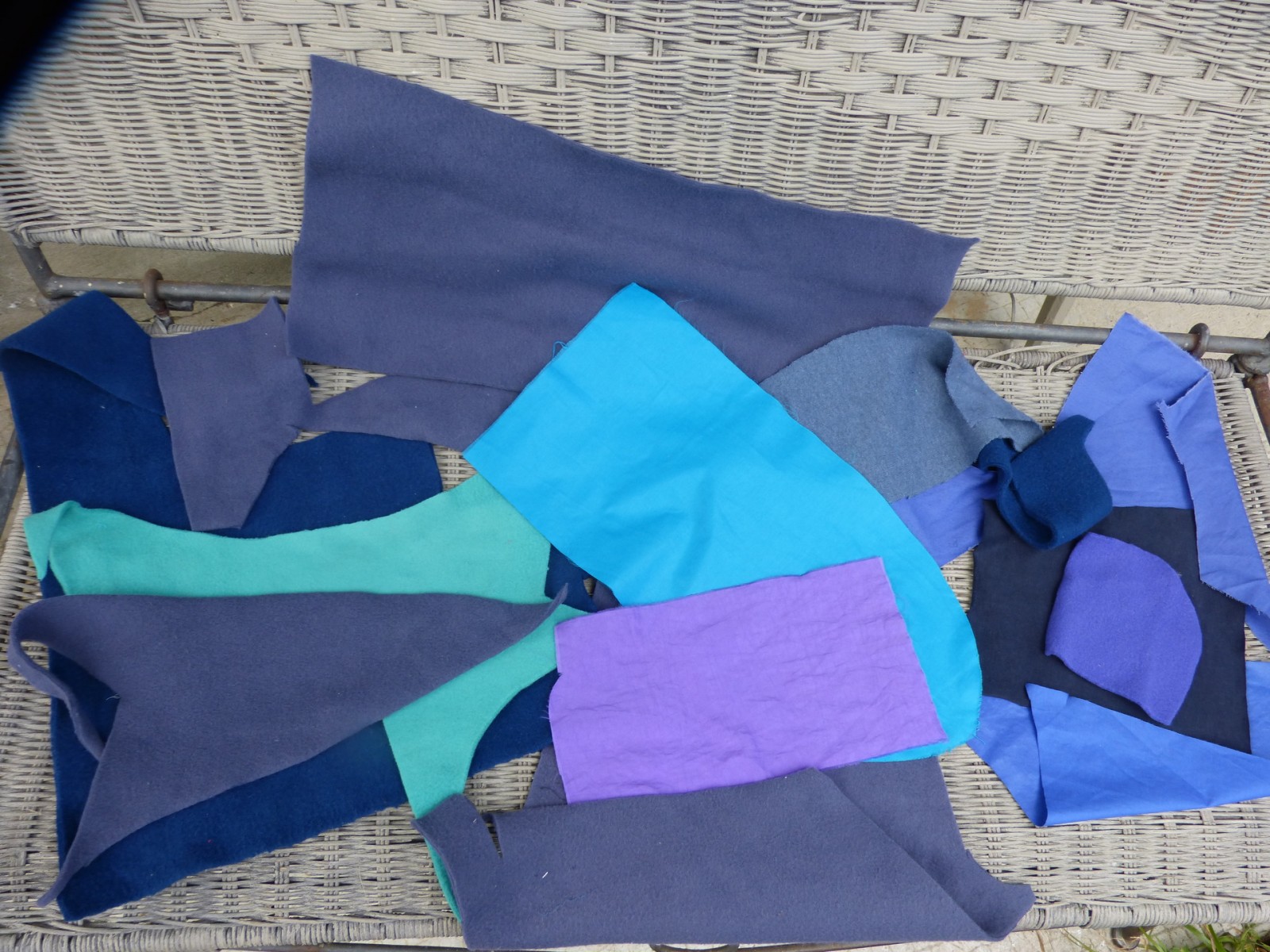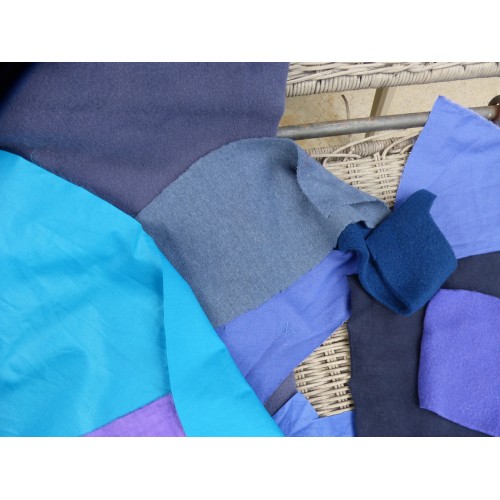Il y a 13 morceaux de tissu. Le plus grand morceau de polaire violet mesure 49cm x 31cm environ, le bleu marine 38cm x 28cm et se prolonge d'une bande. Il y a aussi de la polaire d'un beau vert lumineux 31cm x 20cm environ. Les tissus sport sont très solides pour réparer des anoracks, coupe-vents; le violet nylon tactel fait 15cm x 27cm, le beau bleu turquoise 41cm x 20cm, ensuite il y a 3 morceaux bleu violet assez grands, puis du sweet bleu jean 12cm x 28cm, et un bout de jersey de coton bleu marine 22cm x 18cm environ. Lavage à 30°.