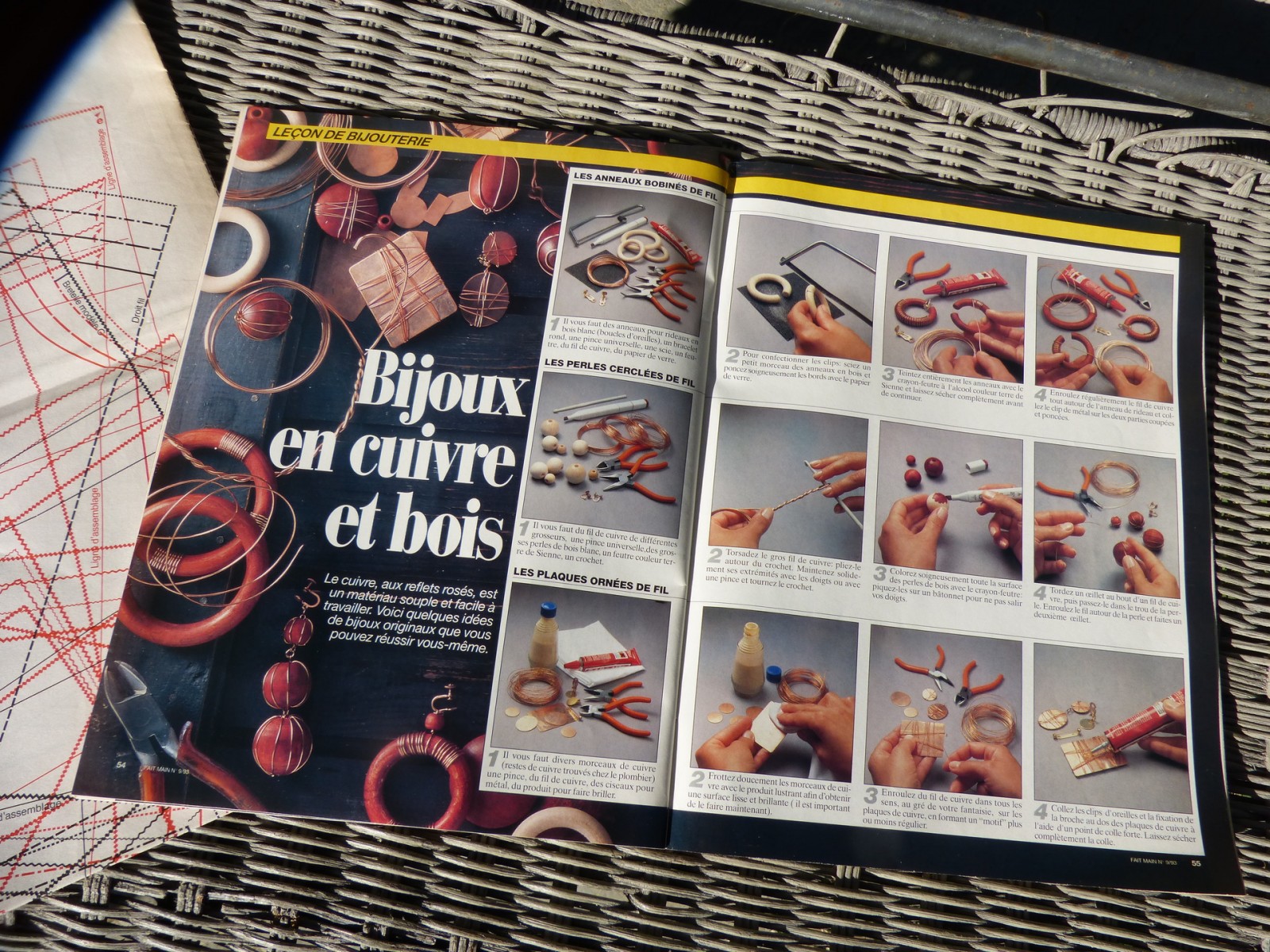 Vous pourrez réaliser des bijoux avec des anneaux en bois et du fil de cuivre. En couture une veste de trappeur en écossais doublé pour Monsieur, un ensemble jupe, tunique, cardigan à coudre dans de la maille, avec tous les conseils. Tricot un pull écru en torsades pour enfant 4, 6, 8 ans. Décoration faire des lampes et abats jour papier très sympa, des coussins à pompons et polochon. De la poterie à froid.