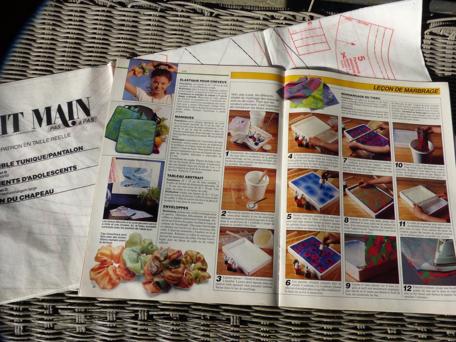 Ce magasine sans publicité tout en couleur vous propose des idées et toutes les explications pour teindre du tissu technique du marbrage et créer des chouchous, un tableau, un abat jour, des tennis imprimées etc. Pour les tricoteuses un beau pull pour bébé et un châle des îles Féroé. En couture vous pourrez créer un blouson en polaire avec capuche pour ado fille ou garçon. Pour femme une tunique évasée et un pantalon, des bérets en polaire; et bien d'autres choses.