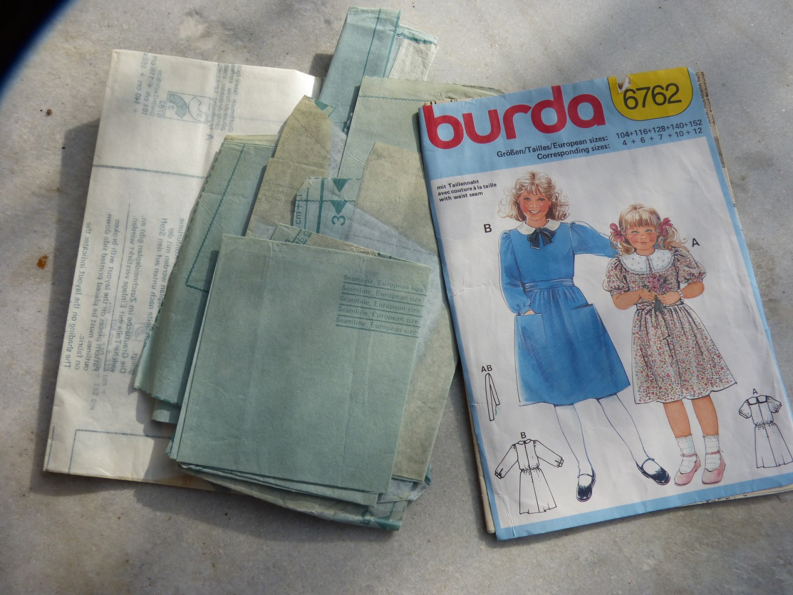Ce patron est déjà découpé. Une grande feuille donne toutes les explications en Français et en Allemand, ainsi que le plan de coupe, le métrage de tissu qu'il vous faut, et choix du tissu. La robe a une couture à la taille, elle est froncée, elle a une ceinture nouée. Fermeture éclair dans le dos. Col Claudine ou col plus large en broderie. Manches longues avec poignets ou manches ballon. La robe tombe sous le genoux.