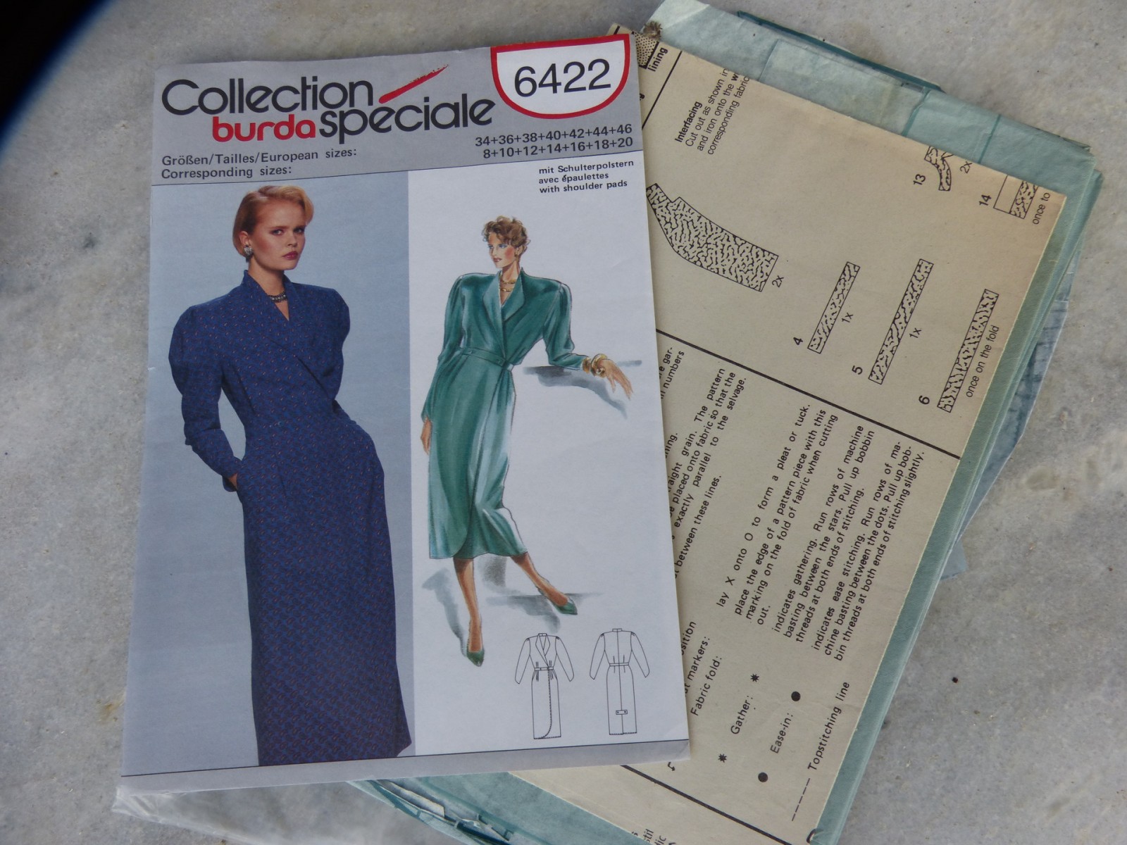Cette robe a une forme porte-feuille, elle tombe sous le genoux. Le col monte derrière la nuque et il s'ouvre en croisant devant. Cette robe vous donne une belle allure car elle met en valeur les épaules; les manches sont froncées au niveau des épaules et partent en se rétrécissant vers les poignets. Des explications et croquis vous guident dans une fiche technique séparée.