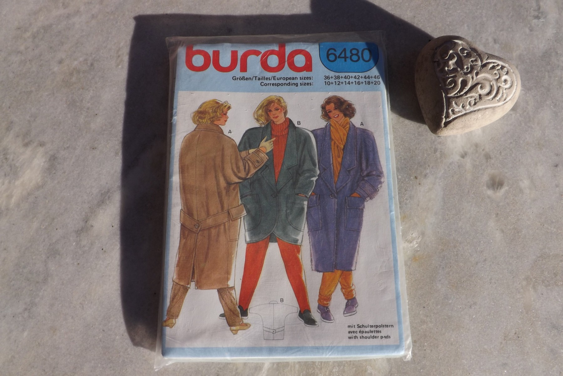 Dans cette pochette vous trouverez une grande feuille patron à découper sur le trait correspondant à votre taille; les explications et les croquis d'assemblages accompagnent le patron sur une autre feuille. Il y a tous les conseils: métrage de tissu à acheter, vérifier vos mesures, le plan de coupe. La pochette plastique n'a pas été ouverte, état neuf. Ces modèles de manteaux classiques datent de 1980 environ. Col tailleur plongeant devant pour laisser voir le pull ou l'écharpe. Un seul gros bouton ferme le manteau. Manches kimono et pattes décoratives. épaulettes. Grandes poches plaquées avec rabats. Martingale et fente dans le dos.