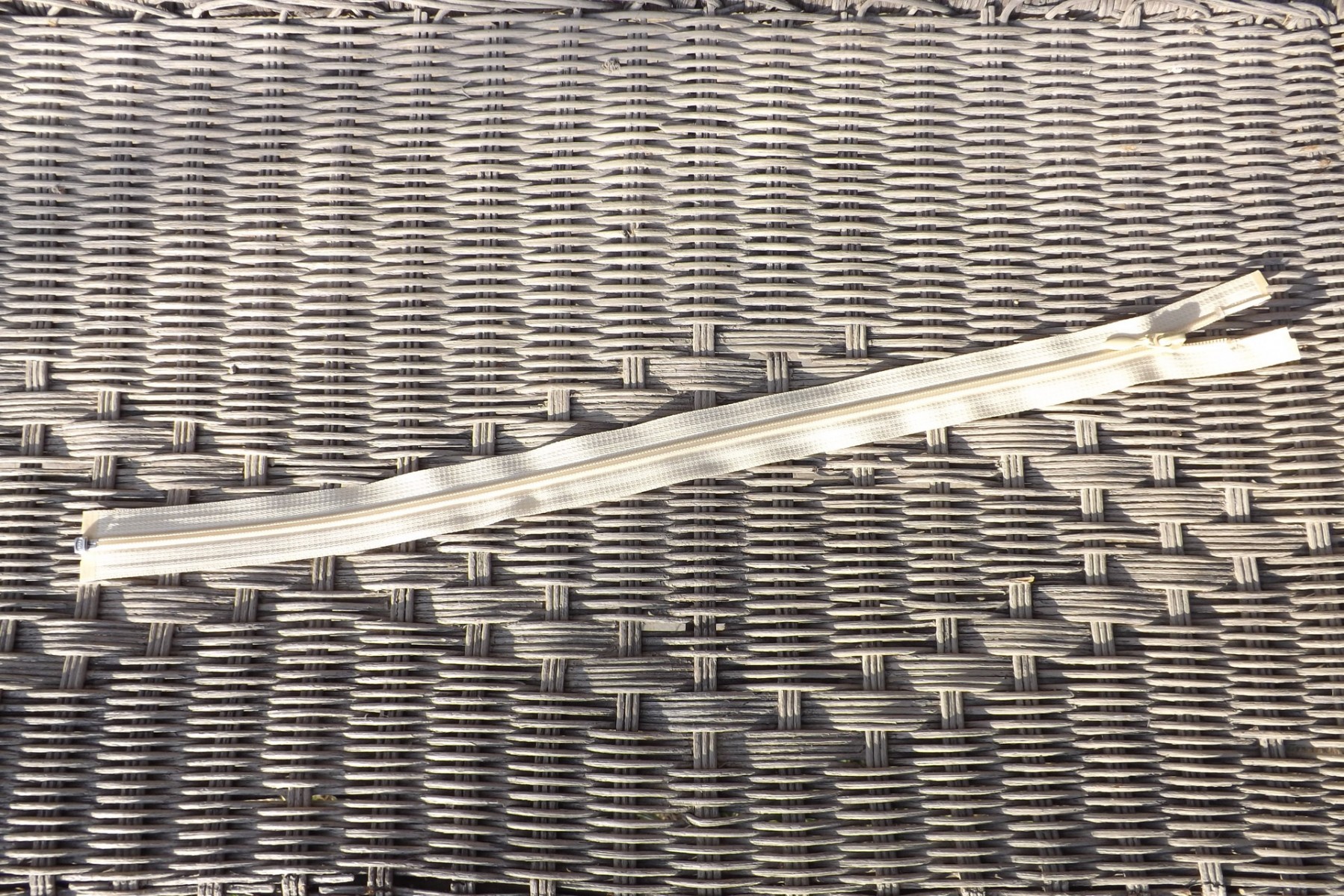 Fermeture éclair en plastique de qualité 50 cm, séparable pour blouson, gilet, coupe vent etc. On peut l'utiliser en non séparable pour un coussin par exemple. Largeur de la partie plastique: 5mm, largeur totale: 2,8cm. Curseur en métal peint en beige clair. Bas de la fermeture en métal argenté inscription marque ykk. état neuf.