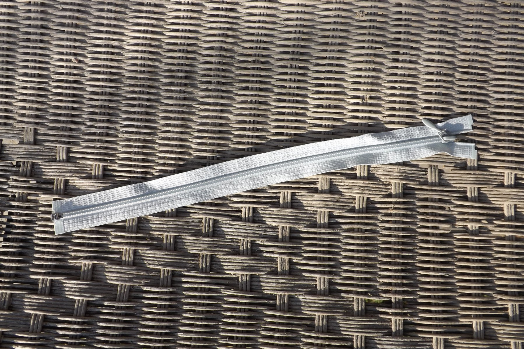 Fermeture éclair de marque ykk en plastique gris bleu détachable, longueur 35cm (sans compter les 2cm de tissu synthétique qui dépassent et que l'on rentre dans le vêtement. Bas de la fermeture en métal argenté. Largeur de la partie plastique: 5mm, largeur de la fermeture: 2,8cm. Curseur et sa tirette en métal peint du même gris bleu.