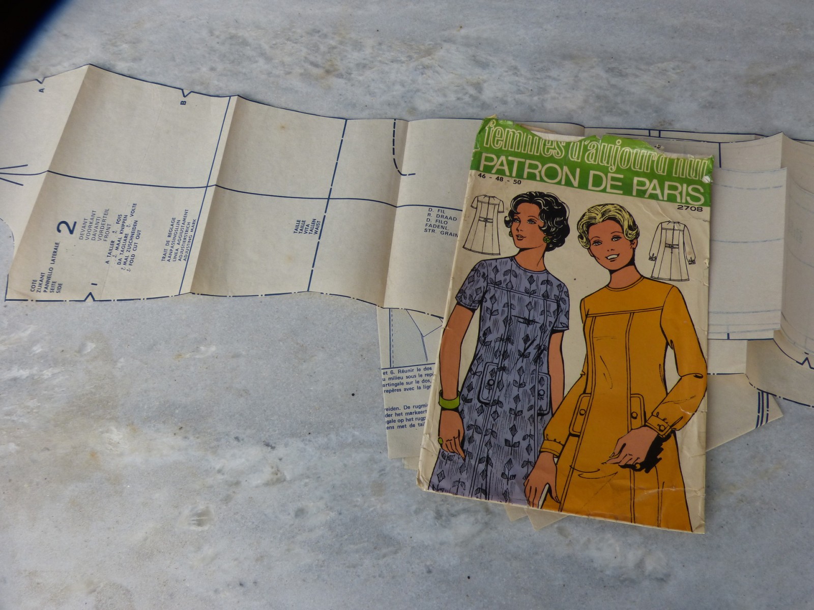 Patron déjà découpé en taille 46. Explications, plan de coupe et croquis d'assemblage sur une feuille séparée. La robe encolure ras du cou, empiècement horizontal, et découpes verticales surpiquées. Fermeture éclair milieu dos et petite martingale boutonnée. Option manches courtes ou manches longues avec poignets boutonnés. Rabats de fausses poches forme arrondie pris dans les coutures verticales.