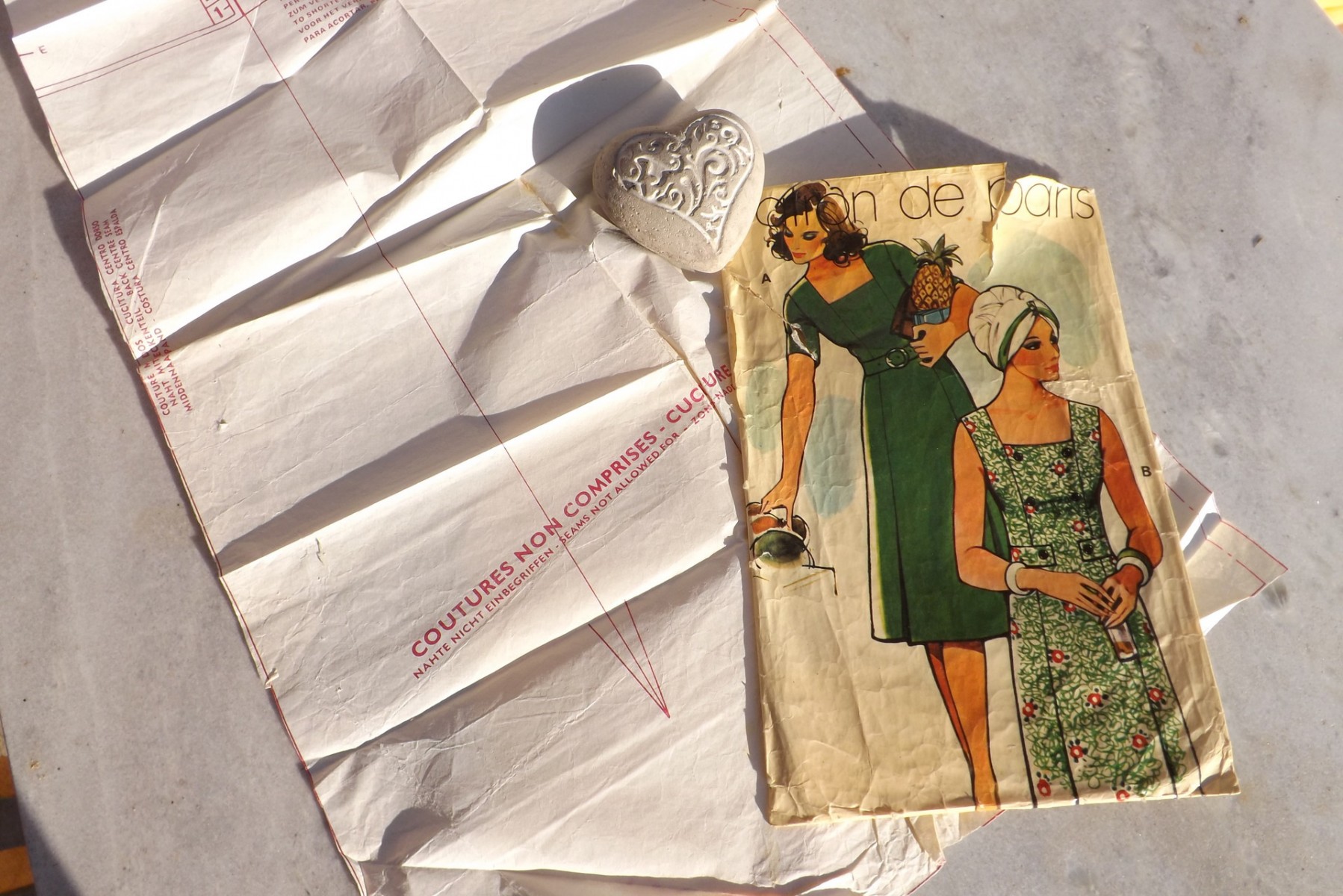 Ce patron est déjà découpé en taille 46, pour la taille 44, il suffit de découper sur le trait qui correspond. Une fiche technique avec des explications et des croquis, vous guide. La robe a un décolleté carré, des découpes devant et dos; un modèle sans manches et un modèle avec manches courtes. Deux propositions de ceintures. La robe a une forme évasée et tombe sous le genoux. La pochette est un peu déchirée mais le patron est en bon état.