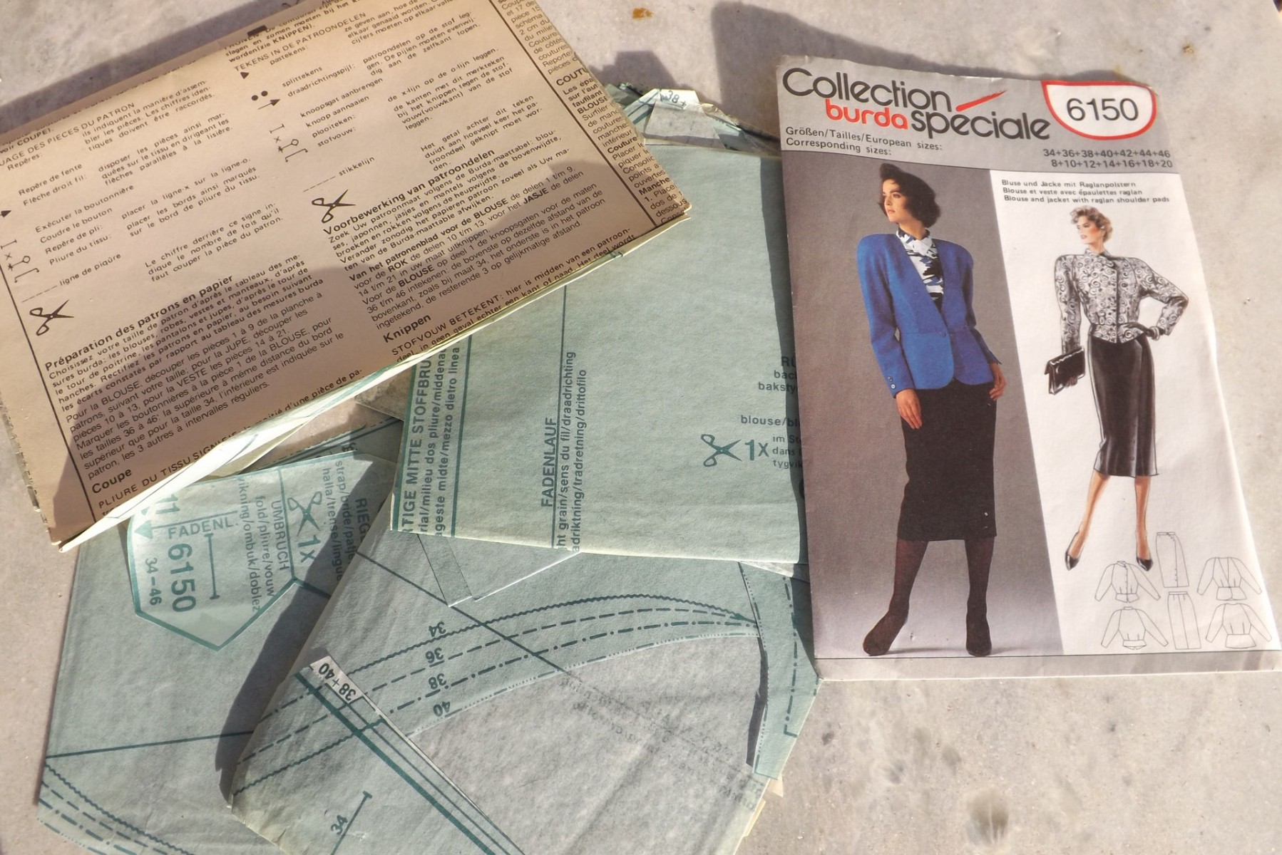 Ce patron est déjà découpé en taille 40; si vous voulez une taille plus petite il suffit de découper sur le trait correspondant. La veste bleue a des manches longues, elle est arrondie au bas du milieu devant et se boutonne par un seul gros bouton. Décolleté en v pour laisser voir la blouse qui est une veste plus courte avec un col qui se ferme par une patte. La veste a une découpe horizontale au niveau de la taille. La jupe classique est droite avec fine ceinture et des pinces; il y a une fantaisie en forme de triangle devant et des boutons.