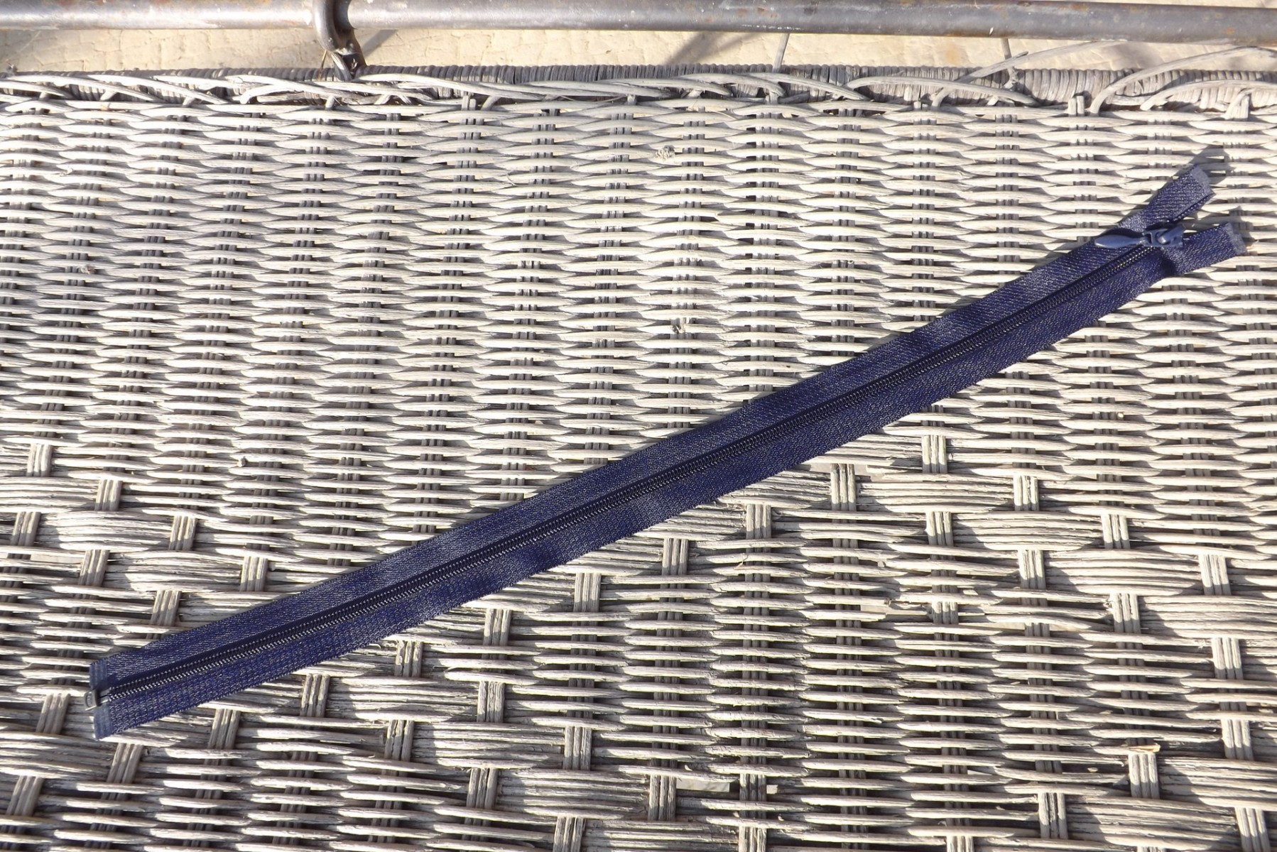 Fermeture éclair séparable de marque YKK en plastique bleu marine avec un seul curseur articulé en métal peint bleu marine. Longueur 46cm plus 2cm de tissu en haut pour rentrer dans le vêtement. Largeur de la partie plastique où passe le curseur 5mm, largeur totale 3cm. Le bas de la fermeture est en métal couleur bronze. Peut convenir pour faire un grand sac genre besace, sac à bandoulière etc.