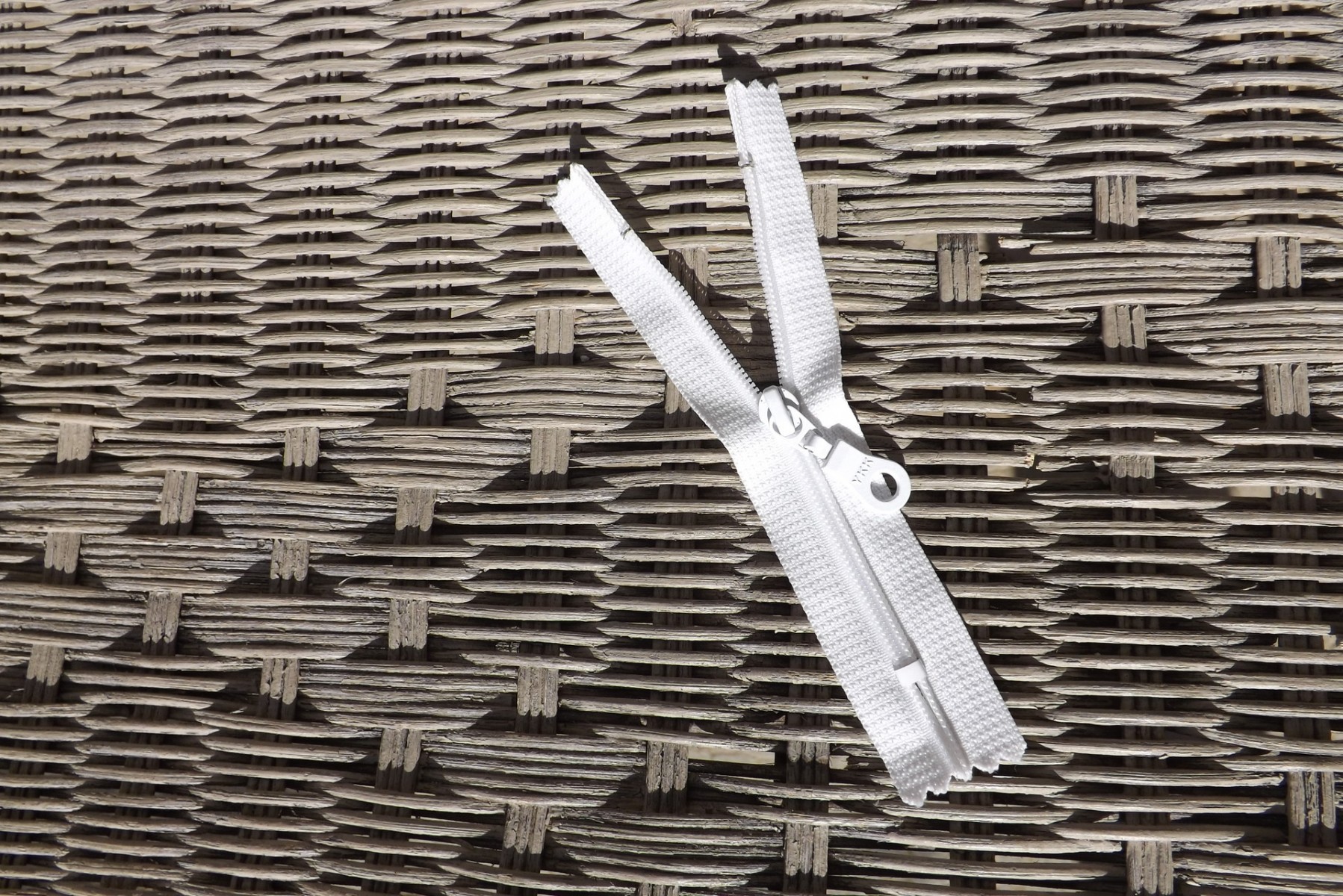 Fermeture éclair de qualité, marque YKK, blanc, 12cm plus 2cm de tissu en haut et bas pour la couture sur le vêtement. Curseur en métal blanc et tirette articulée de 3cm. Largeur de la partie plastique où passe le curseur 5mm, largeur totale 2,8cm.