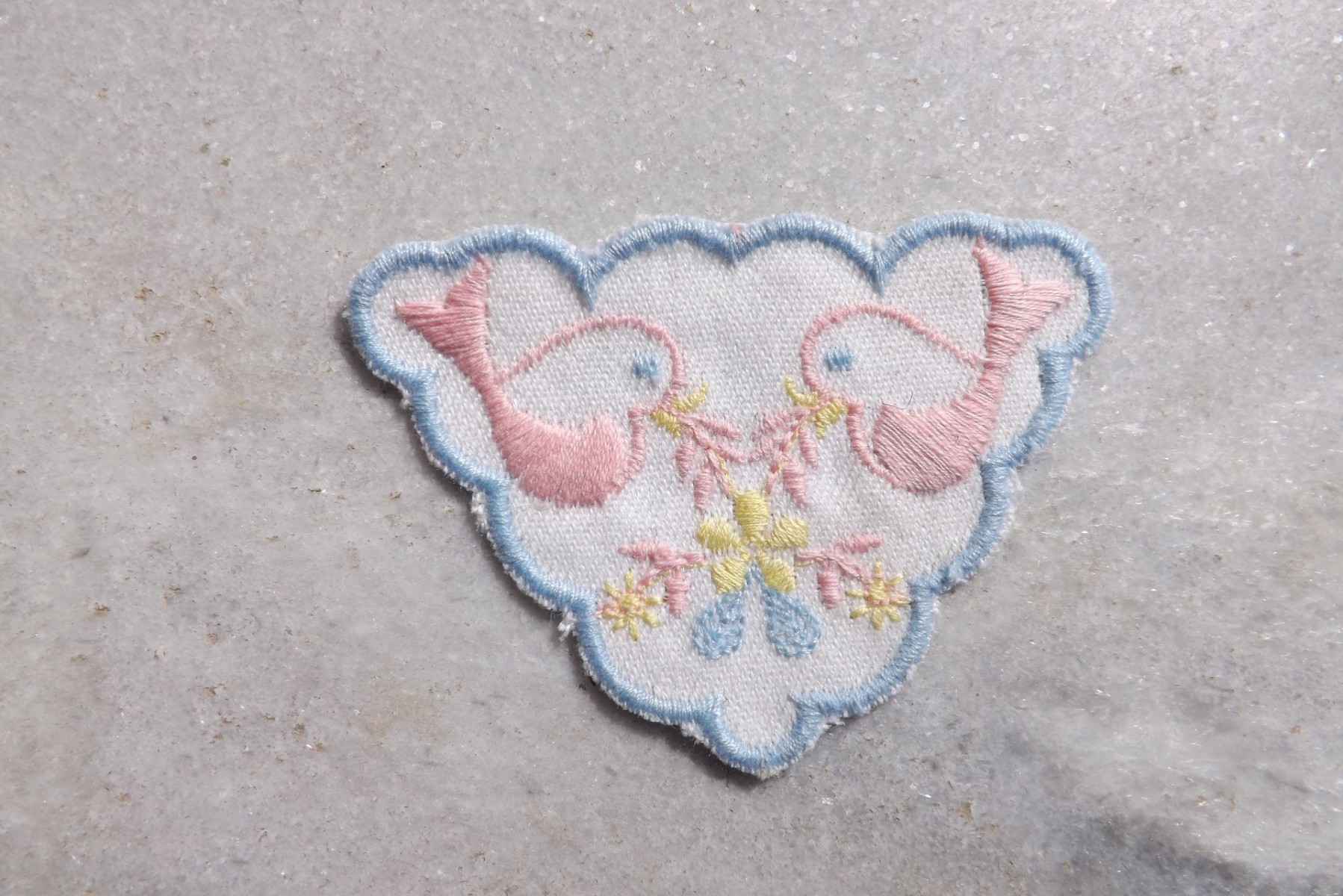 Deux oiseaux roses face à face avec des fleurs jaune,bleu ciel et branches roses; le tour de l'écusson est brodé à la machine en bleu ciel et forme de vagues. L'écusson est en toile de coton blanc forme triangulaire pointe en bas. Dimension large 7cm haut 5cm. à coudre à la machine ou à la main. Lavable à 40°. Envoyé en lettre.