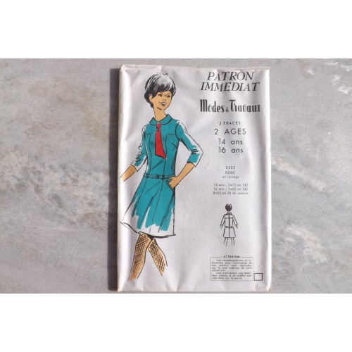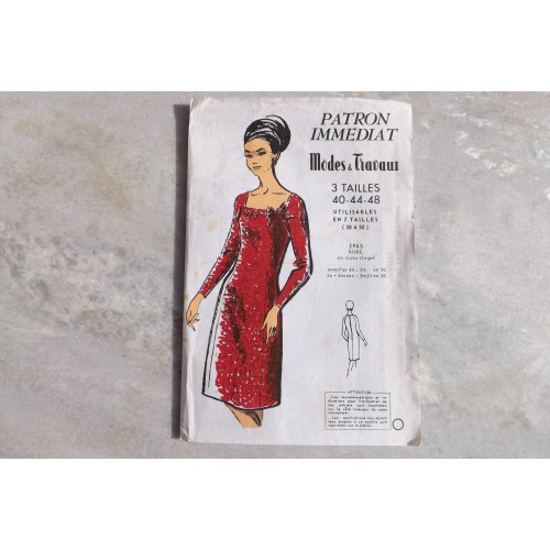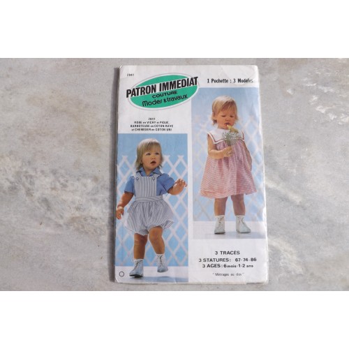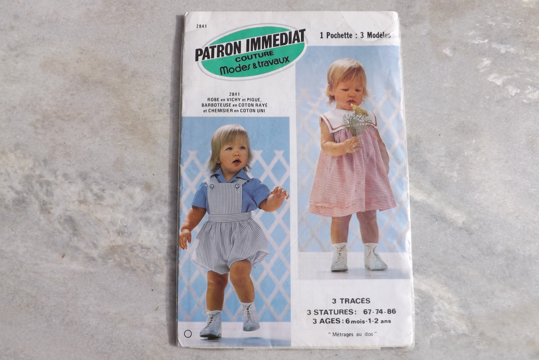 Ce patron est en papier et n'a pas été utilisé; il est en 6mois, 1an et 2 ans, il vous suffit de découper suivant le repère de la taille choisie. La petite robe en coton vichy a un style marin avec son col blanc à bordure rouge. Empiècement sur le haut de la robe d'où partent les fronces. Couture milieu dos, ouverture haut du dos et boutons.