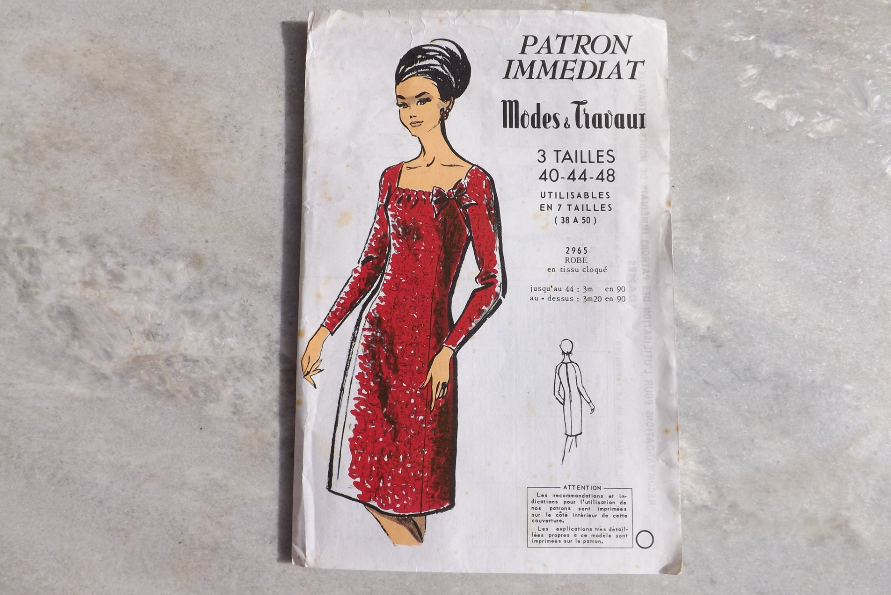 Ce patron est en papier; il a déjà été utilisé et il est déjà découpé en taille 48. Vous pouvez le recouper en taille 44 ou 40 en suivant le repère. Cette belle robe est présentée en tissu cloqué couleur bordeaux; elle a des découpes devant, encolure carrée froncée par un noeud côté gauche. Manches longues. Fermeture éclair milieu dos.