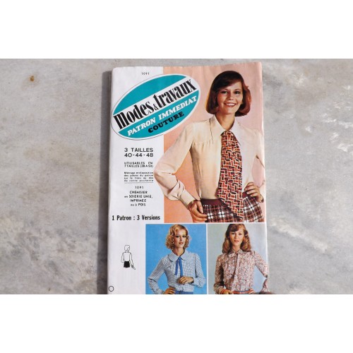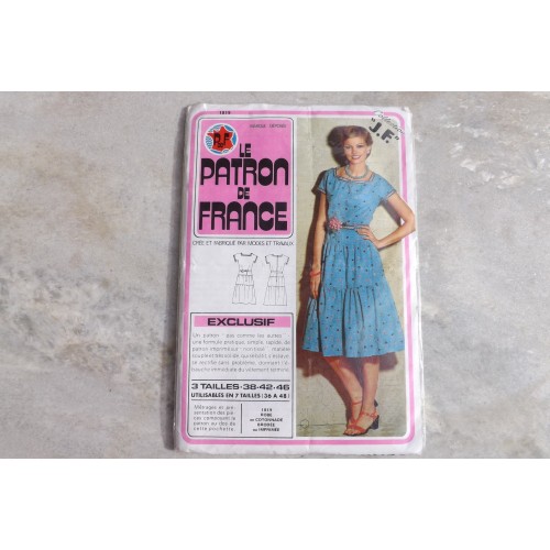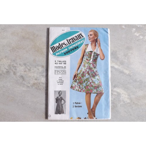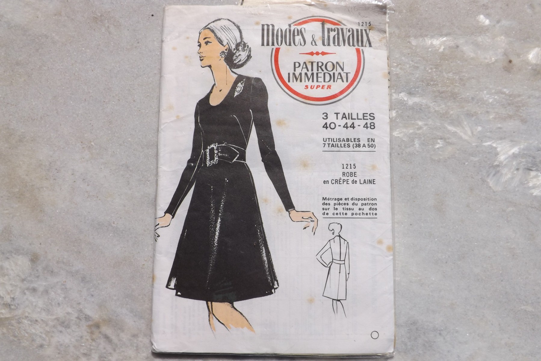 Ce patron est en papier; il a déjà été utilisé et il est découpé en taille 48; pour avoir une taille plus petite il suffit de découper suivant le repère. Cette robe en crêpe de laine a une forme évasée, des pinces de poitrine, une encolure ronde un peu décolletée, des manches longues. Large ceinture avec grosse boucle rectangulaire. Fermeture éclair dans le dos. Le plan de coupe se trouve au dos de la pochette. Le fiche technique dans la pochette vous guide avec des croquis d'assemblage.