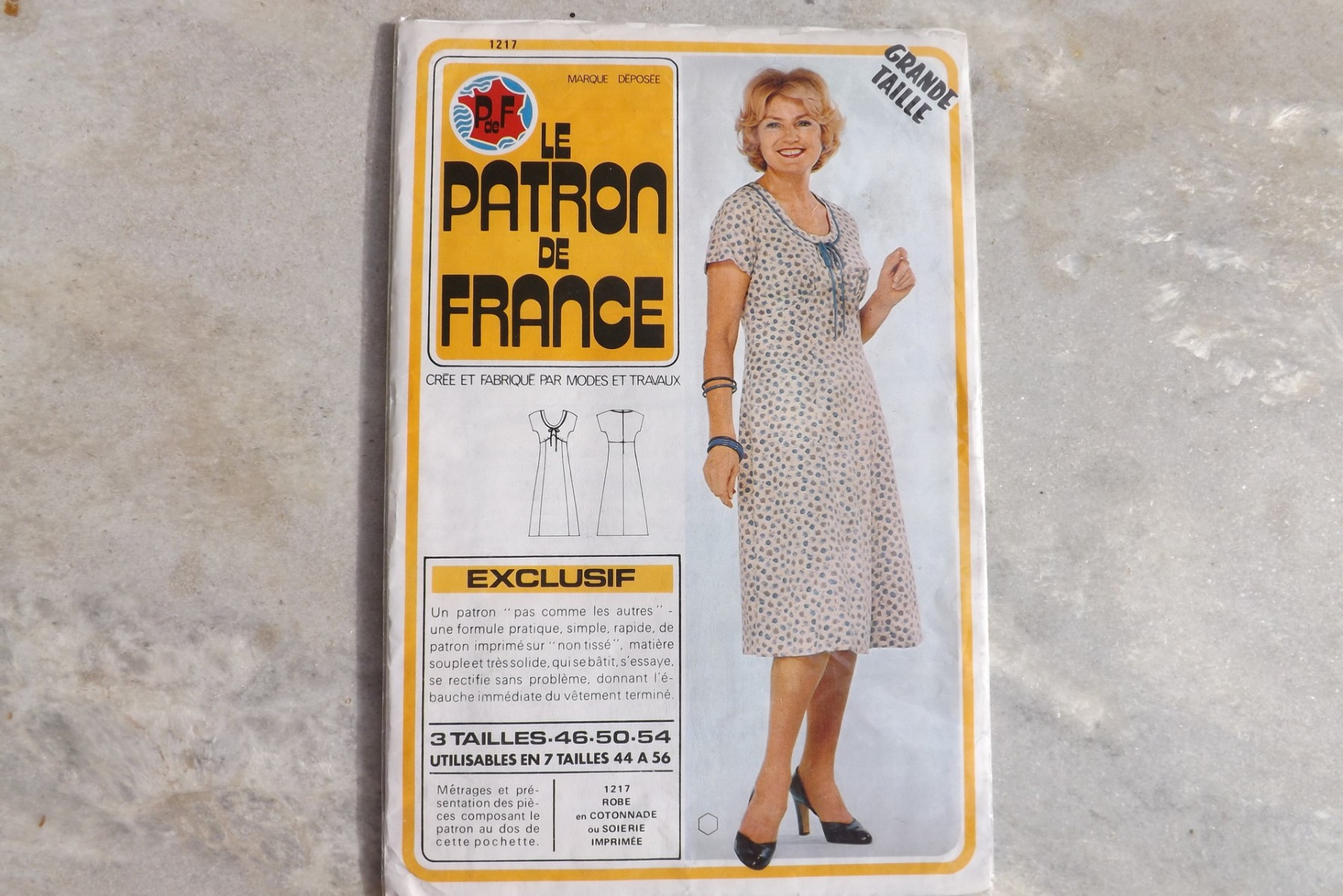 Ce patron est en non tissé (matière entre le papier et le tissu qui peut être facilement retouchée sur le mannequin). Le patron a été utilisé, il est déjà découpé en taille 54. Une belle coupe évasée, décolleté arrondi, manches courtes, empiècement de poitrine avec fronces sous poitrine. Galon autour de l'encolure avec petit noeud au milieu du devant. Fermeture éclair milieu dos. Métrage en taille 54: 3m70 de tissu en 90 de large (c'est ce qui est indiqué sur le patron; je conseille de prendre un tissu en 120 de large pour couper une robe en grande taille ce sera plus aisé). Le plan de coupe se trouve au dos du patron. Une fiche technique avec des croquis d'assemblage est dans la pochette pour vous guider.