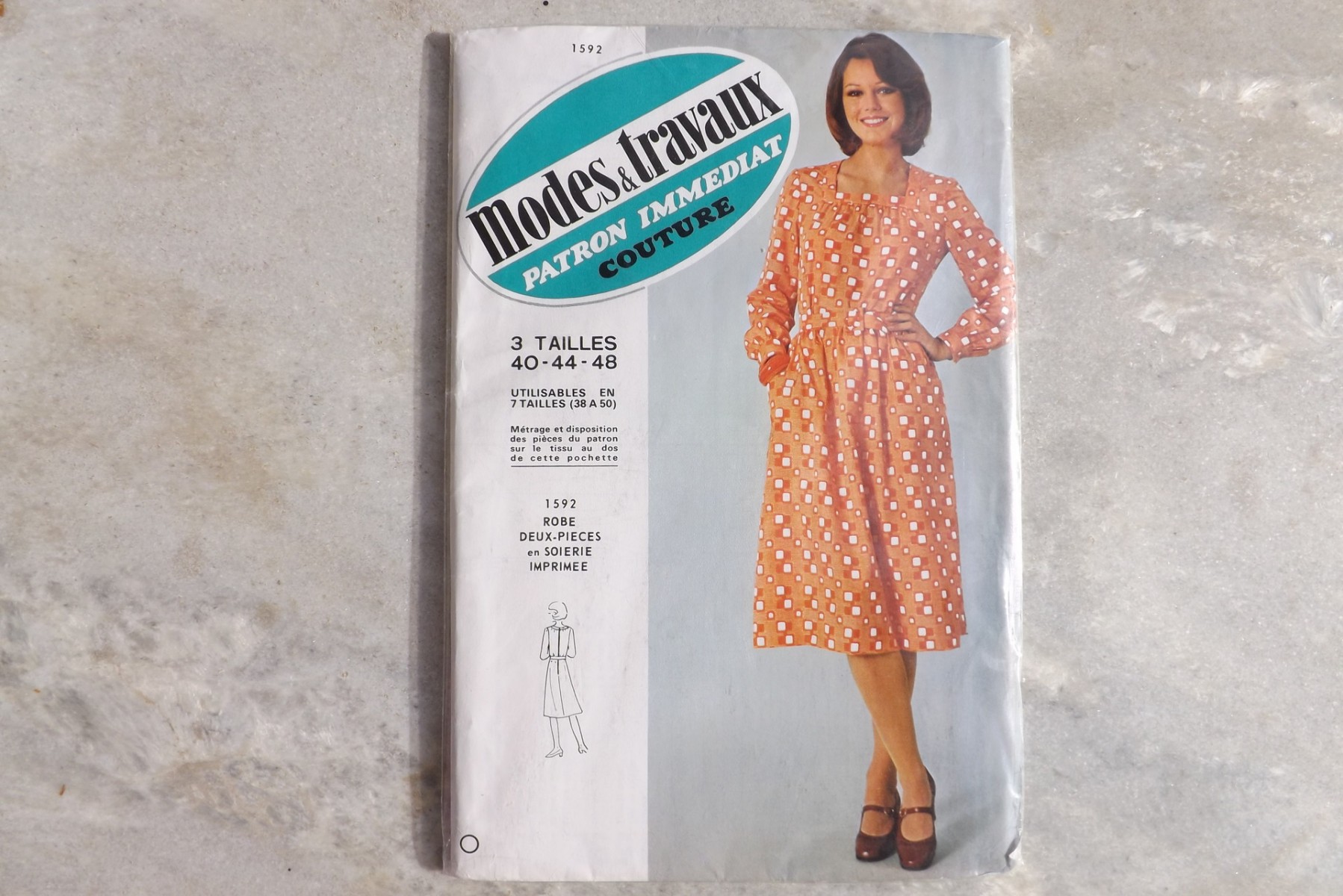 Ce patron est en papier, il est neuf dans sa pochette. Le plan de coupe figure au dos de la pochette avec un tableau de mesures pour vérifier votre taille. Une fiche technique se trouve dans la pochette pour vous guider avec des croquis d'assemblage. Cette robe a des manches longues avec poignets boutonnés, elle est froncée à la taille, elle a une fermeture éclair dans le dos. Encolure carrée froncée sur une bande. Poches découpées et soulignées d'une bande. à couper dans une cotonnade ou soie.