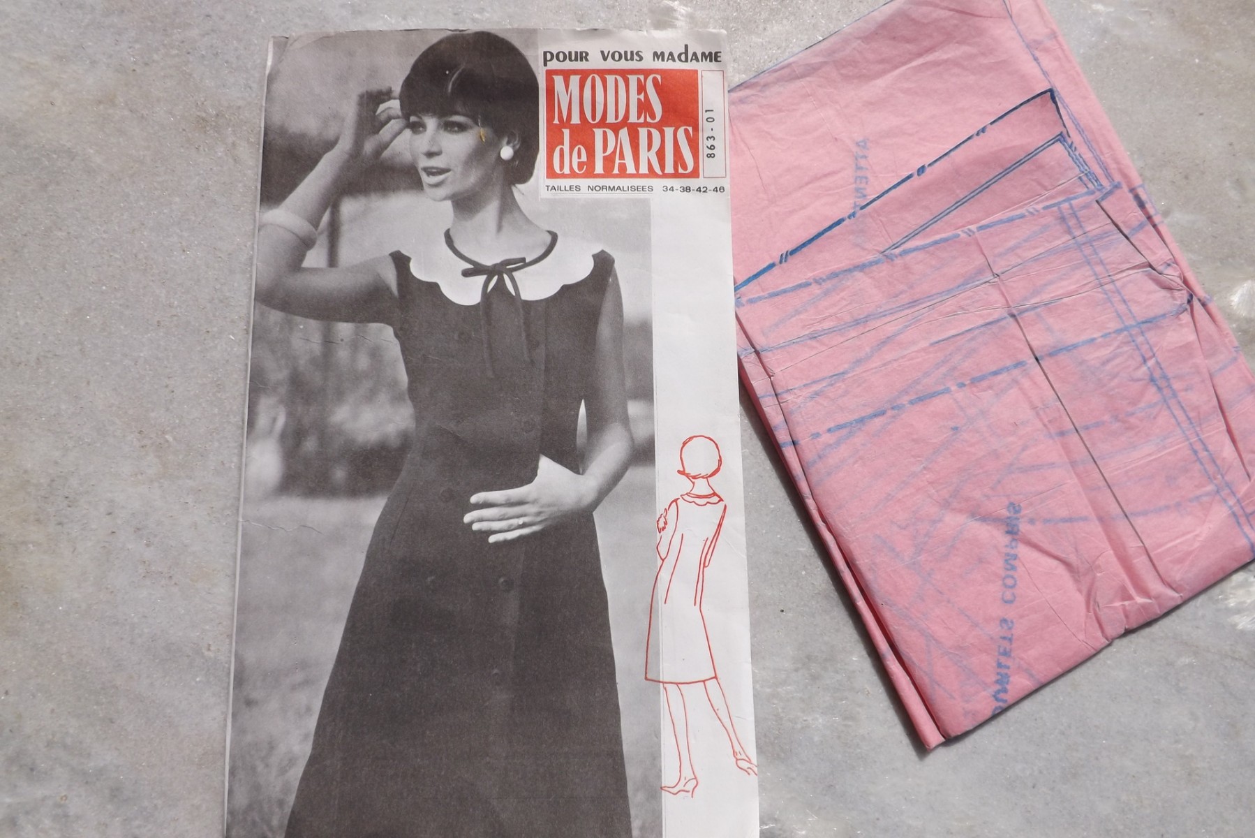 Ce patron est en papier de soie, il est déjà découpé en taille 46; vous pouvez le transformer en taille plus petite en découpant le long du trait qui correspond. Le plan de coupe est au dos de la pochette et les explications techniques à l'intérieur avec des croquis d'assemblage. Cette robe à la coupe impeccable a une forme classique. Le col blanc en forme de fleur et lien noué lui donne un air romantique. Boutonnage croisé, pinces devant, dos et poitrine. Pas de manches.
